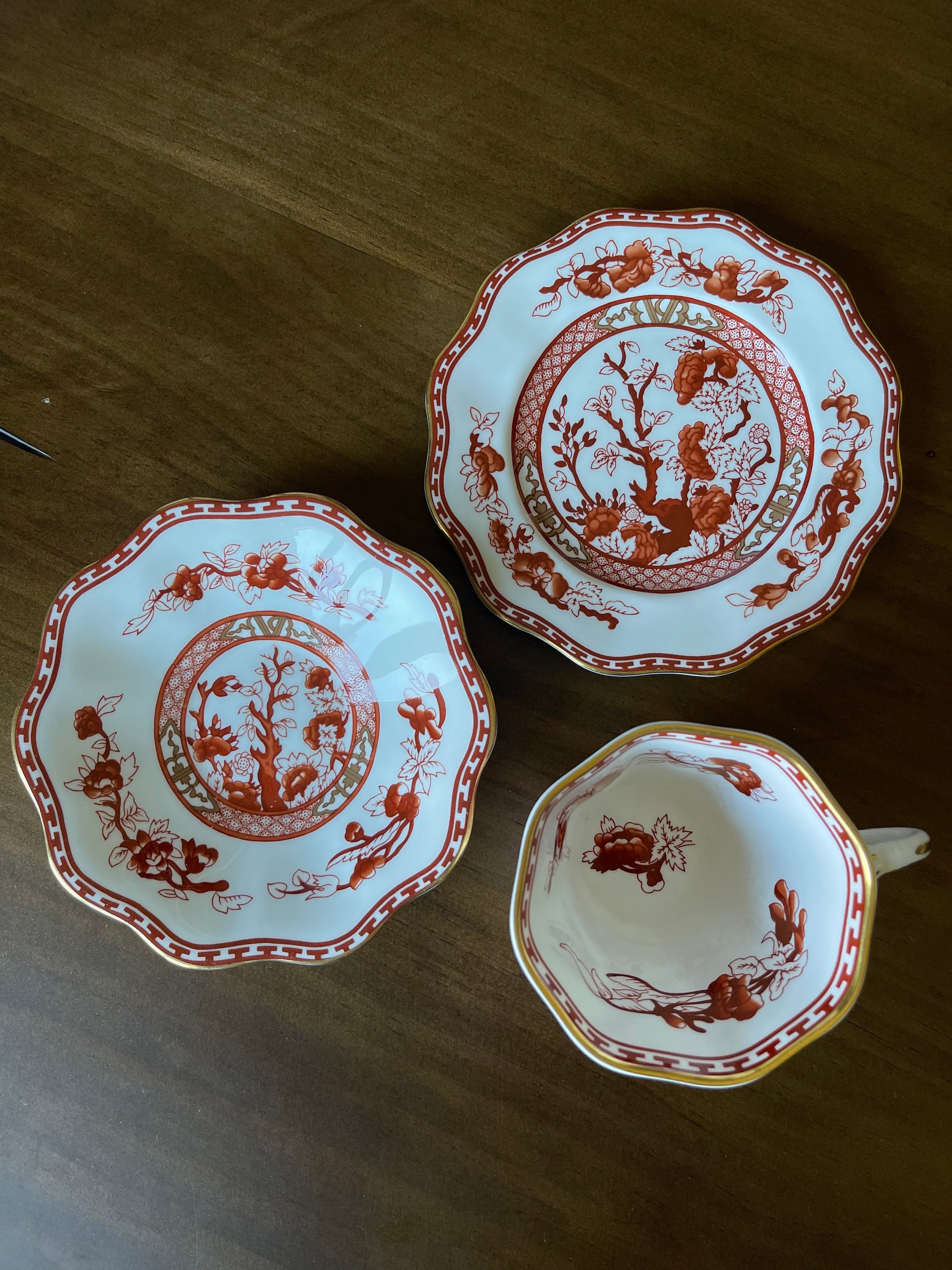 コールポートの代表的なパターン『インディアンツリー』の『コーラル』カップ&ソーサーにサイドプレートを組み合わせたティートリオです。