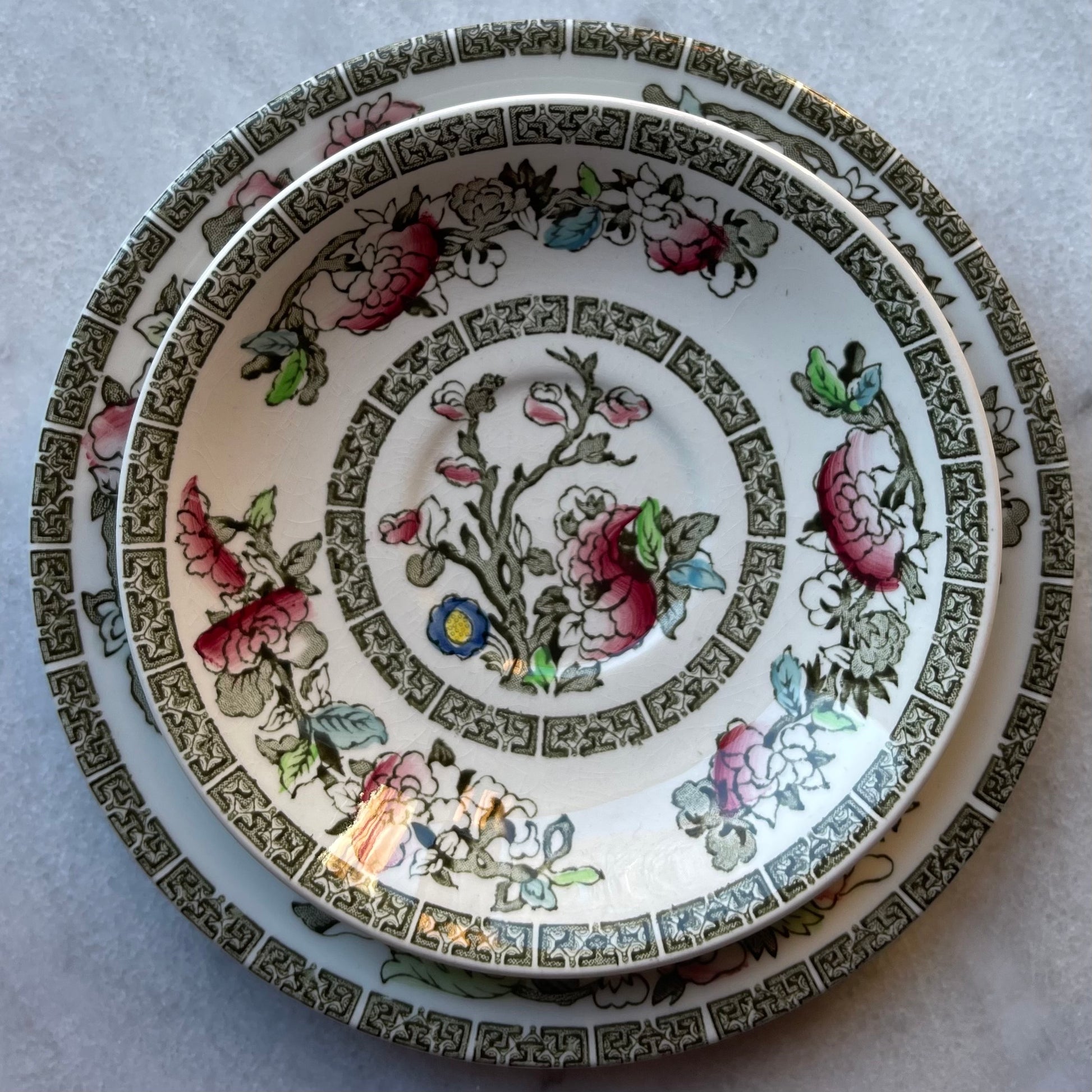 ジョンソンブラザーズのインディアンツリーは、中心は梯梧の木の一種かと思われますが、他社メーカー同様にオリジナルのモチーフ(ブルーの花など)も加わり、特にオリーブオイル色のリムの幾何学文様に至っては、コールポートがシンプルな雷文であったのに対して、より古代的なテイストのデザインが採用されています。