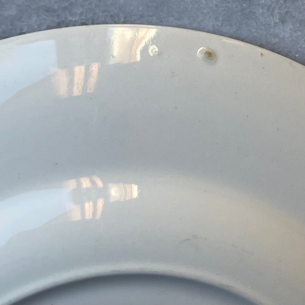 お品物の状態ですが、転写の味わいとも言える、色抜け、図柄のずれ、かすれが見られます。また、製造時の目跡や、拡大写真で見ますとカップの縁が一部荒く凸凹のある表面が確認できるのですが、肉眼レベルでは目立たず、触ってみても釉の層があるためザラツキは感じられません。ごく微小のフリモノもございますが、欠け、傷、貫入などなく非常に良い状態です。全体的に使用感もない綺麗なお品です。
