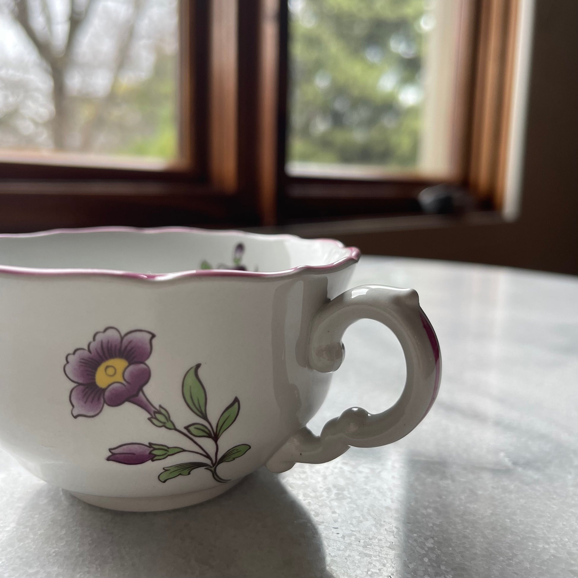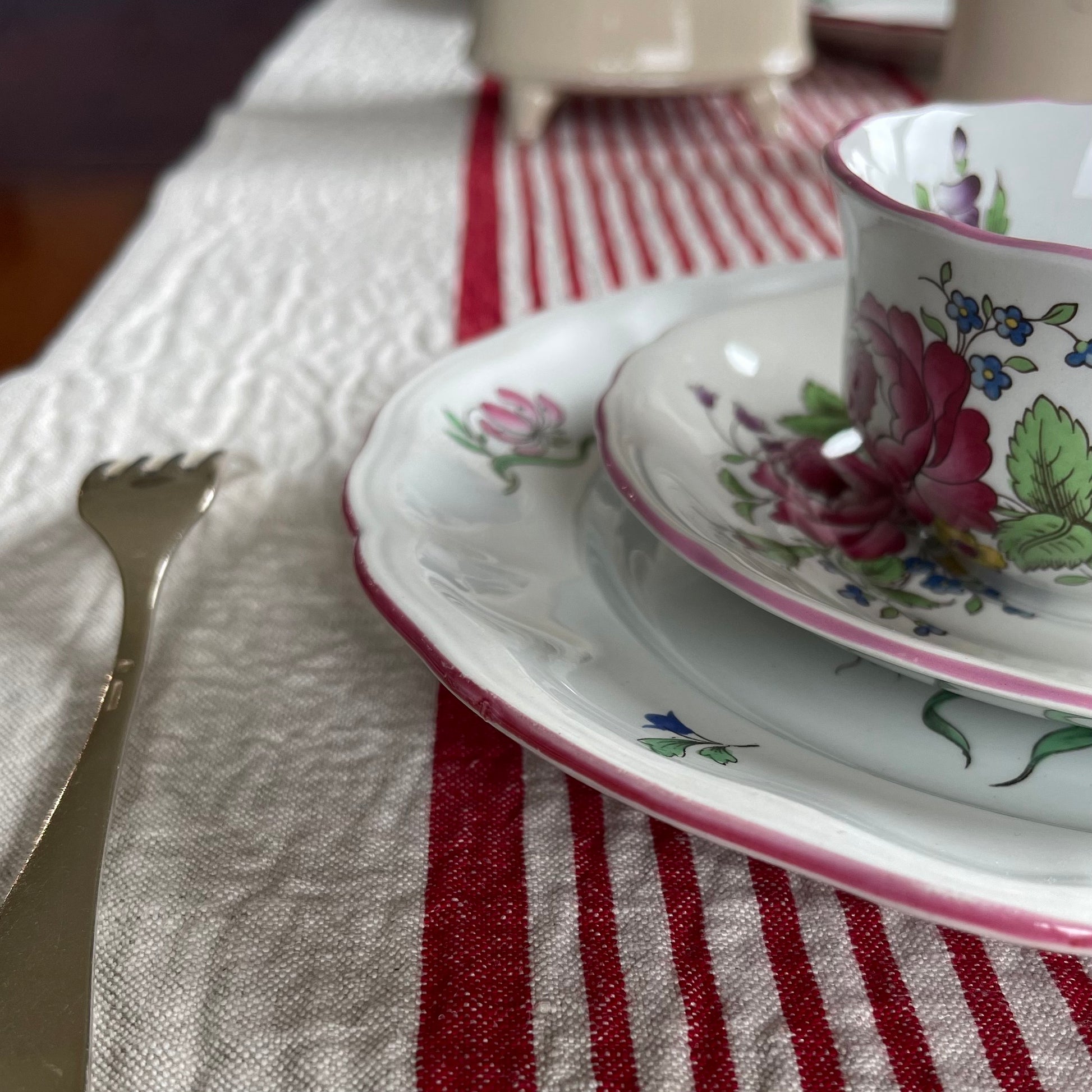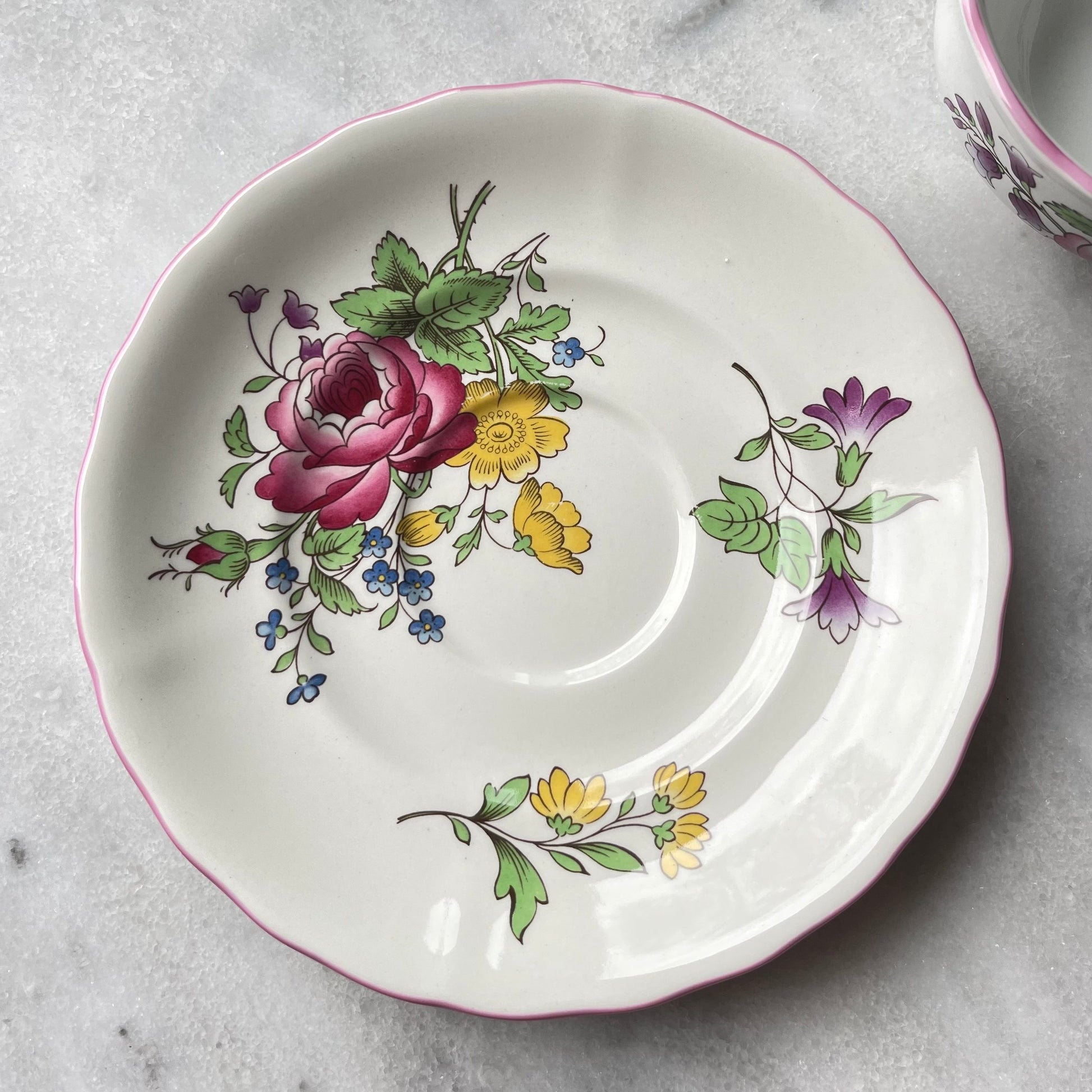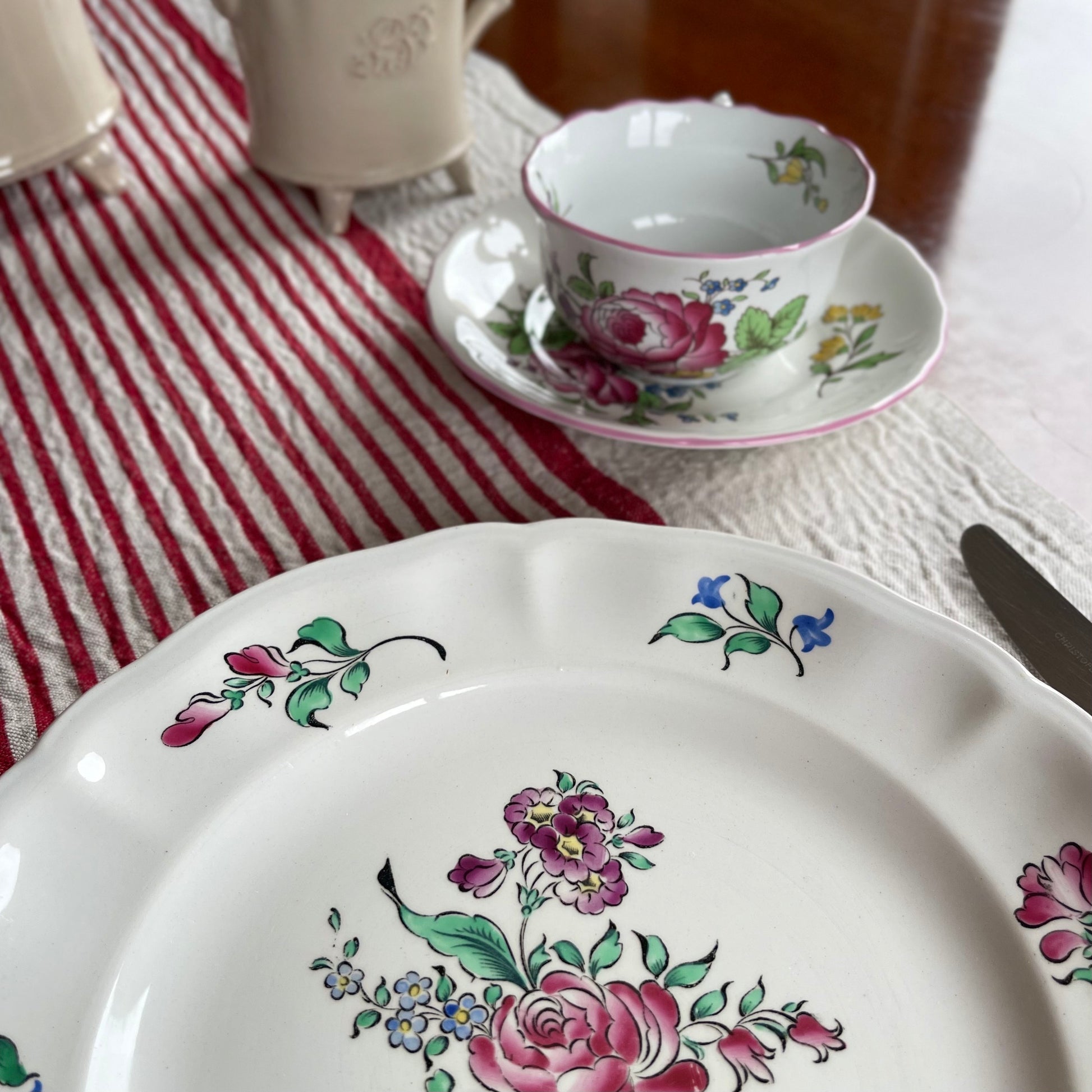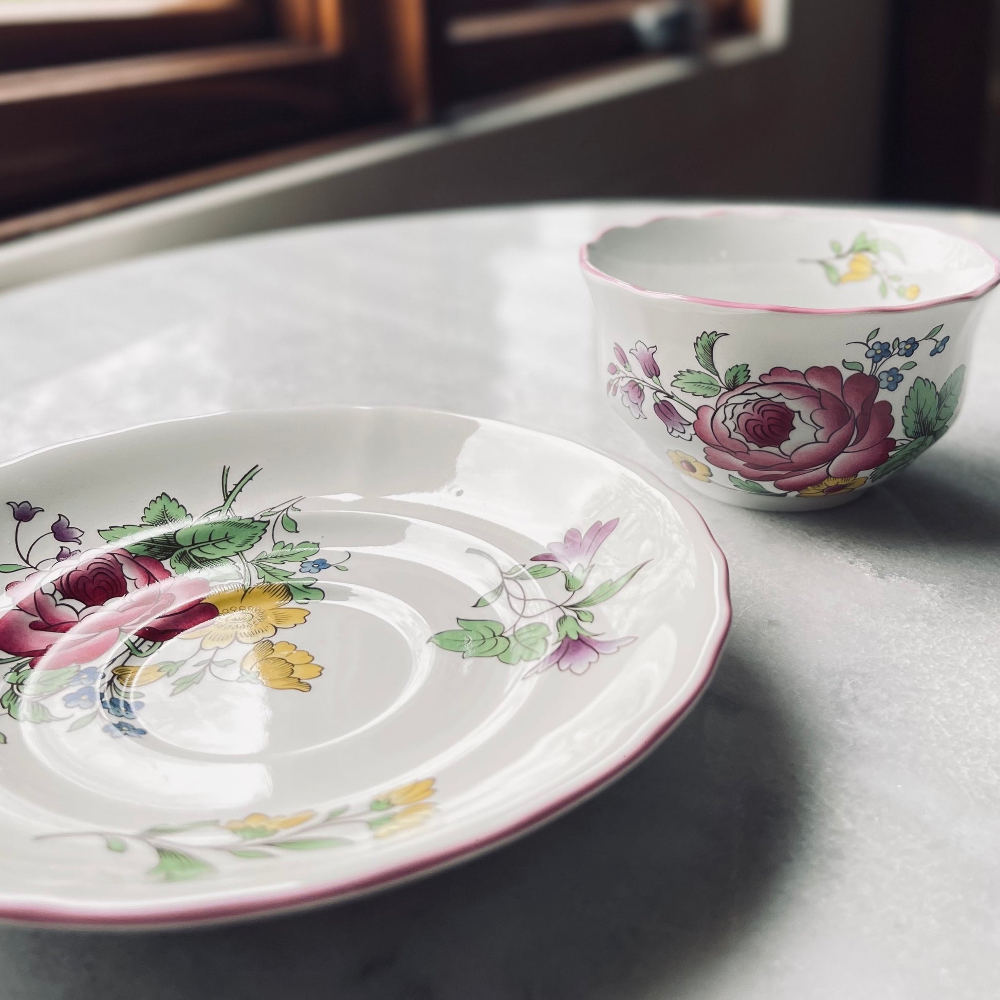 早速、🇫🇷リュネヴィル窯のストラスブール柄プレートと並べて撮影してみましたら、画風は異なるものの、描かれている花々はそっくり。リムのデザインも似ています。リム部分のラインは、リュネヴィルの方が濃いめのピンク、スポードは薄いピンクで、トーンのグラデーションまでもが良い塩梅です。肌地の色は、スポードの『マールボロスプレー』が若干ですがクリーム掛かっています。