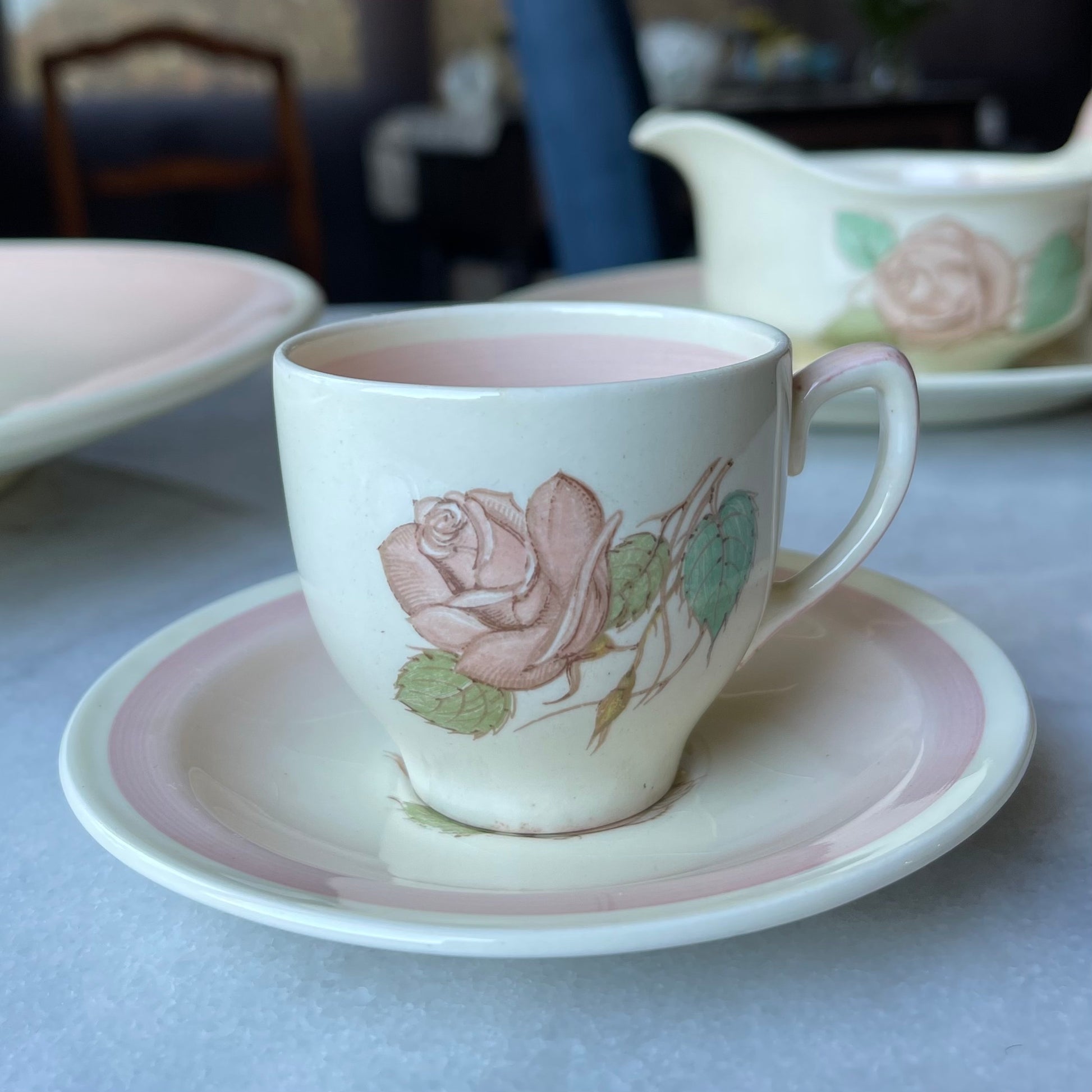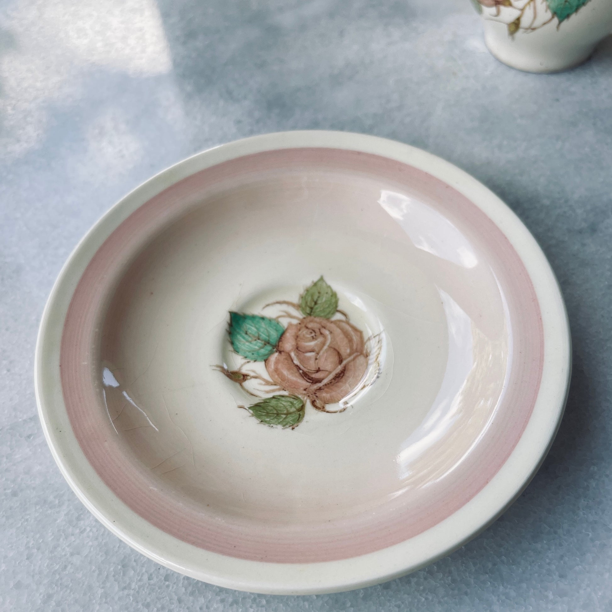 初代<パトリシア>、後に<パトリシアローズ>と呼ばれるようになったパターンが登場したのは1938年のこと。ピンクのバラのモチーフに、徐々にカラーや縁模様などのデザインバリエーションが増えて行ったようです。中心のバラの絵柄は、発表当初からリトグラフ転写が施されています。本品は、店主の感ですと、39年に登場したピンク・ワッシュ・ボーダーだと思うのですが、どうでしょう。