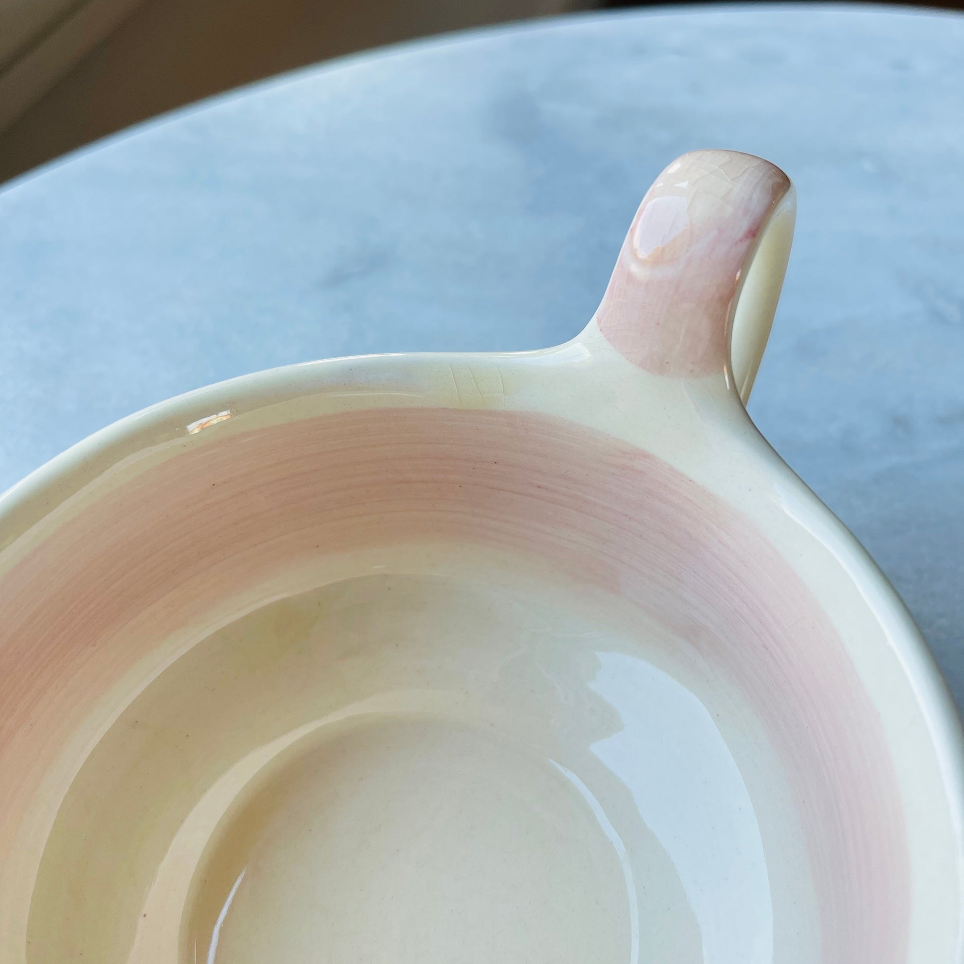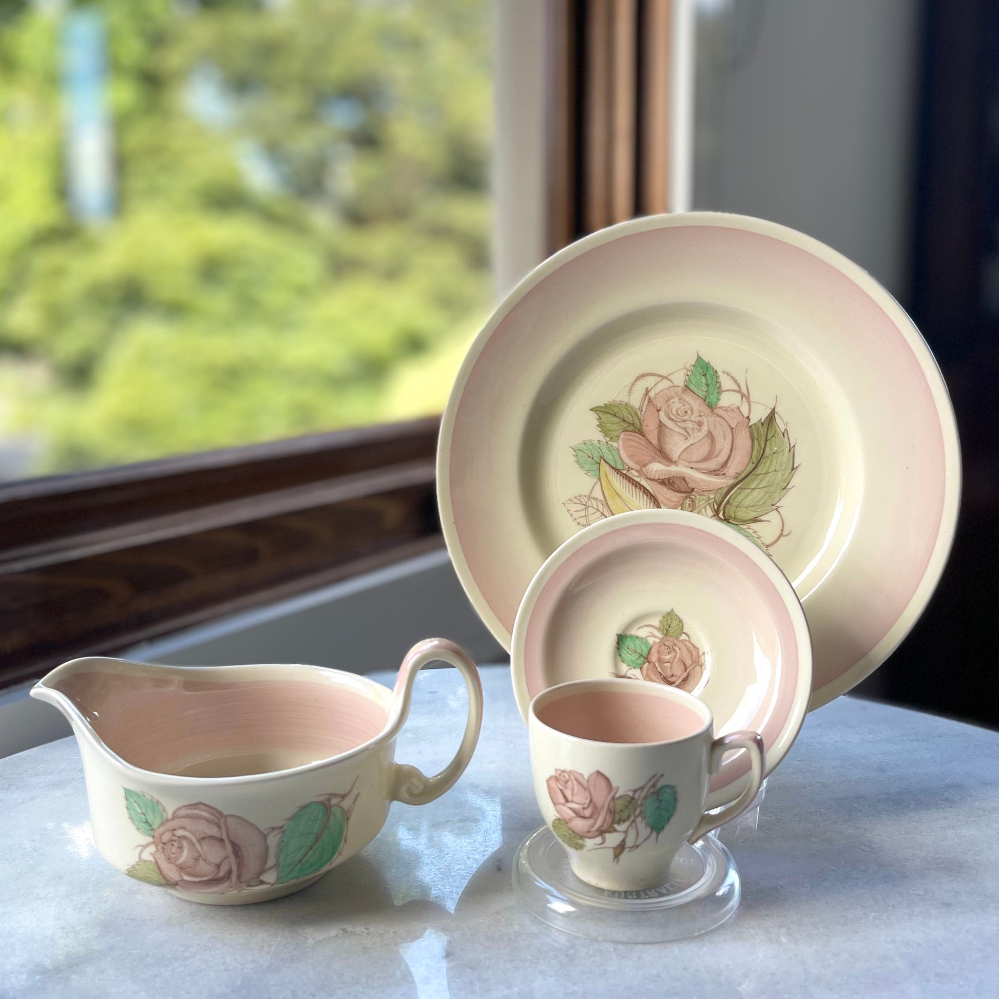 初代<パトリシア>、後に<パトリシアローズ>と呼ばれるようになったパターンが登場したのは1938年のこと。ピンクのバラのモチーフに、徐々にカラーや縁模様などのデザインバリエーションが増えて行ったようです。中心のバラの絵柄は、発表当初からリトグラフ転写技術が使われていたとのこと。本品は、店主の感ですと、39年に登場したパターン番号1657のピンク・ワッシュ・ボーダーだと思うのですが、いかがでしょう。