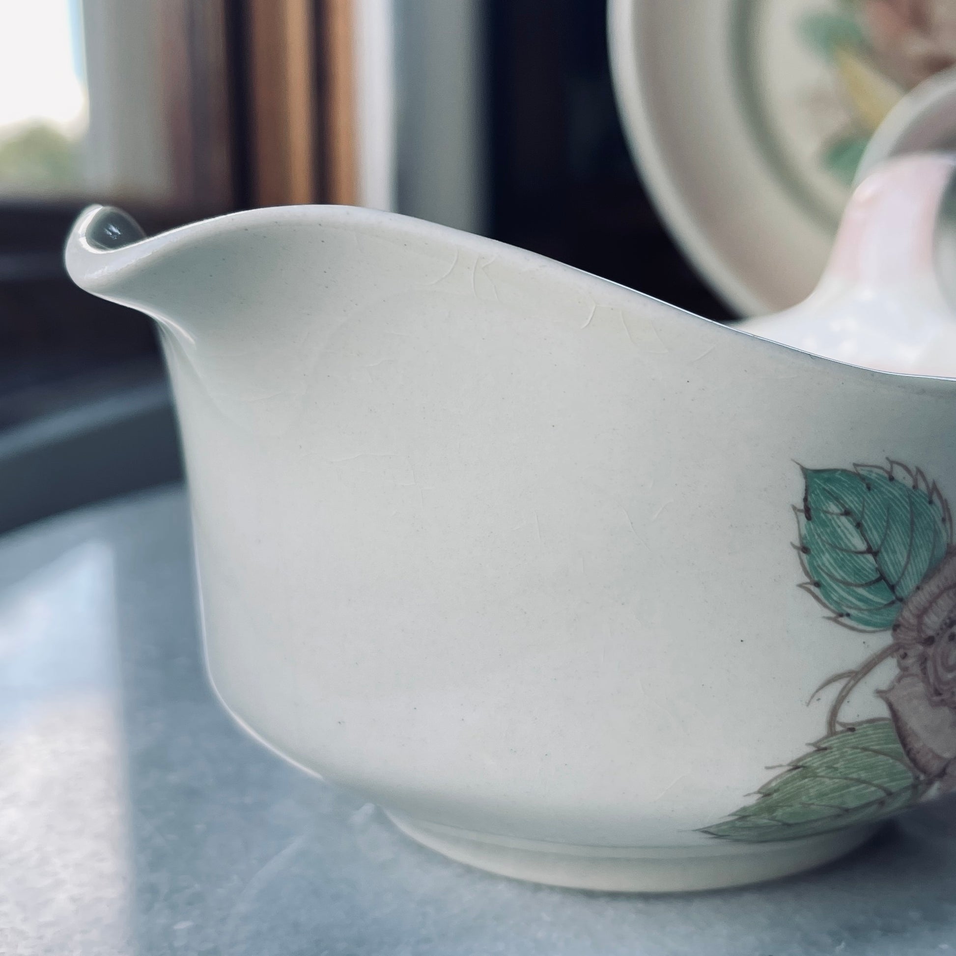 スージークーパーの人気パターン、<パトリシアローズ>のソースジャグです。ローズピンクのバラと、淡いフラミンゴピンクのグラデーションが何とも愛らしいお品です。