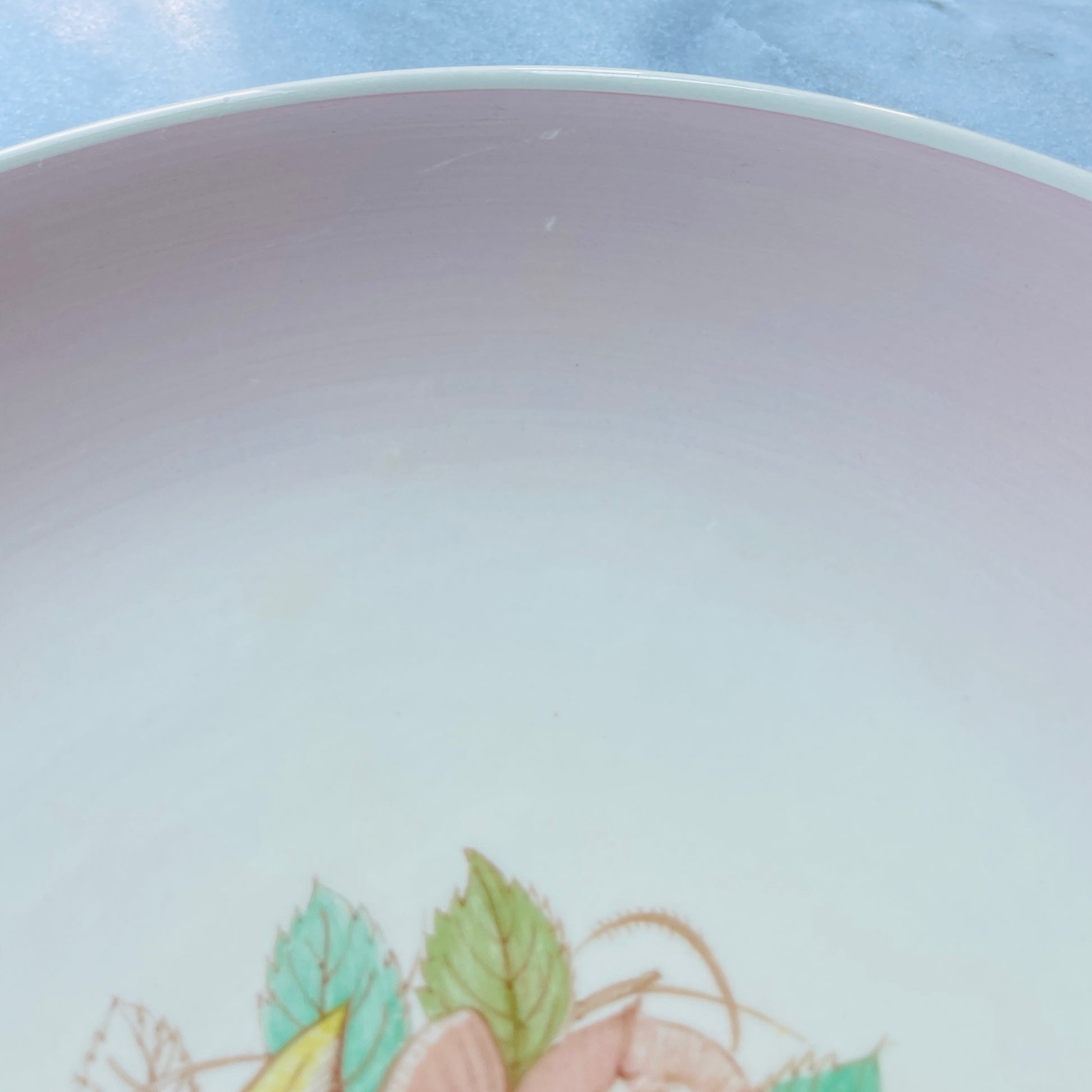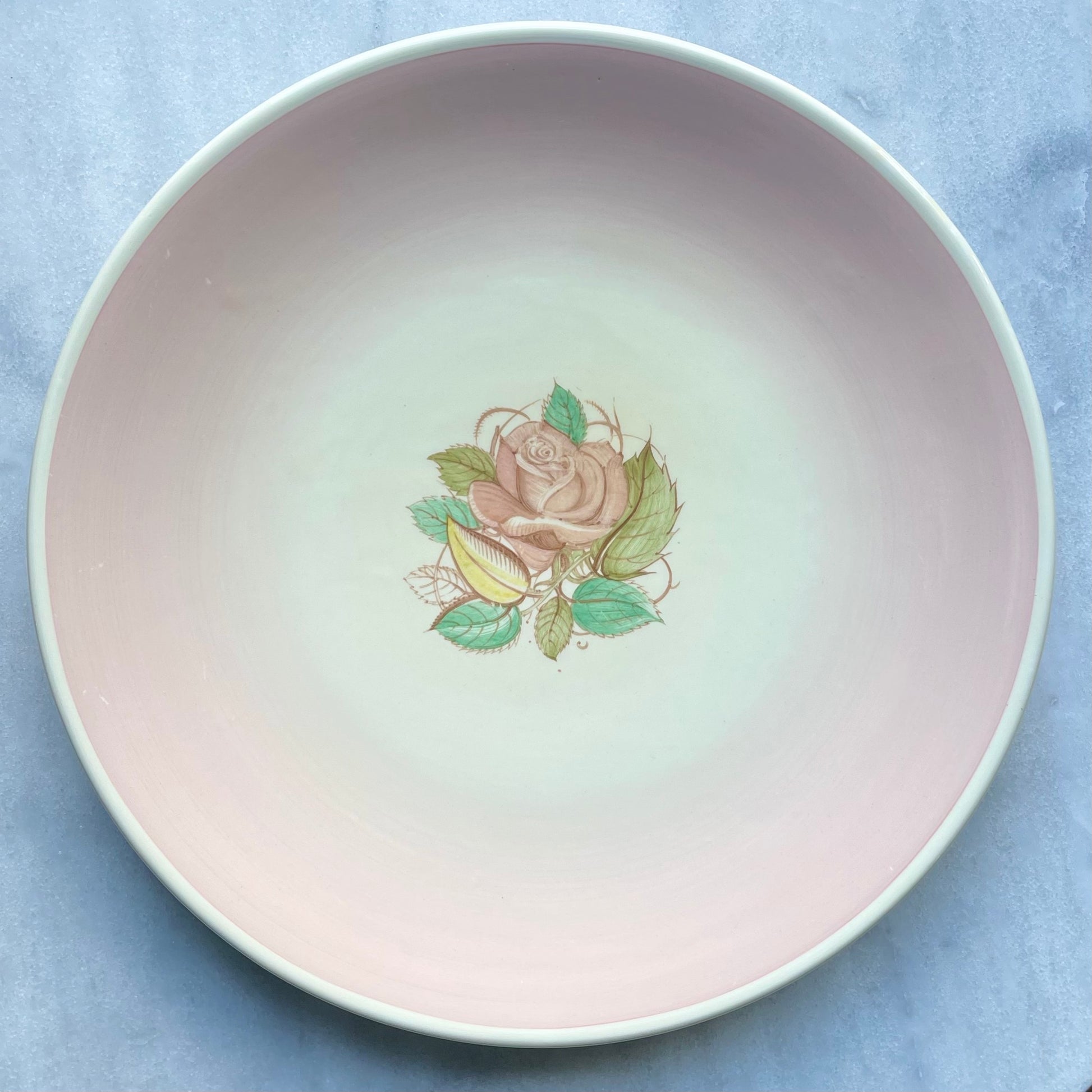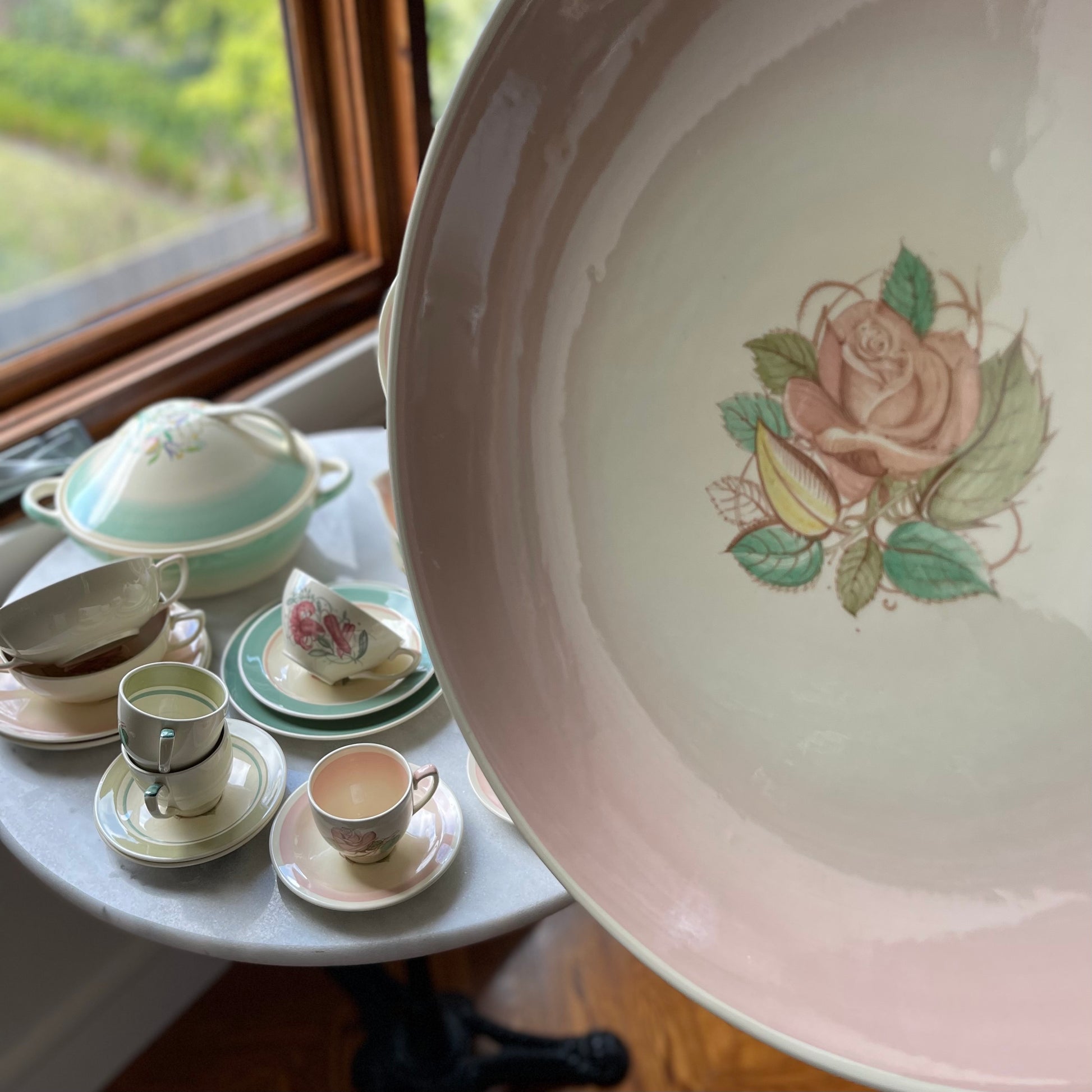 初代<パトリシア>、後に<パトリシアローズ>と呼ばれるようになったパターンが登場したのは1938年のこと。ピンクのバラのモチーフに、徐々にカラーや縁模様などのデザインバリエーションが増えて行ったようです。中心のバラの絵柄は、発表当初からリトグラフ転写技術が使われていたとのこと。本品は、店主の感ですと、39年に登場したパターン番号1657のピンク・ワッシュ・ボーダーだと思うのですが、いかがでしょう。