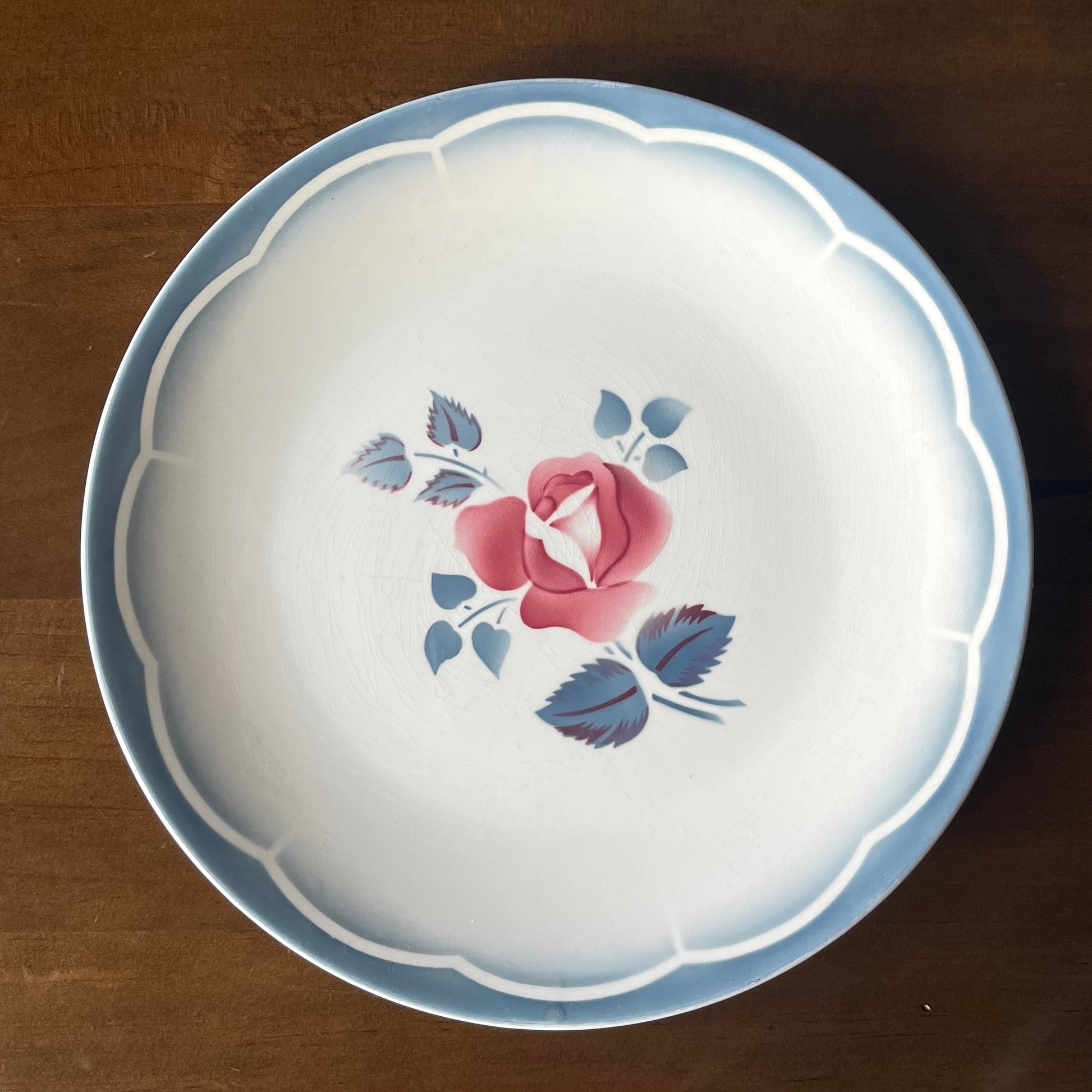 花びらを縁取ったようなステンシルのリム装飾に、中心には薔薇のブーケ。一見レトロなデザインにも受け取れますし、リムカラーのプロバンスブルーは、シャビーシックなインテリアにも、そして実はモダンでシンプルな食卓においても素敵なコーデを演出してくれそうです。