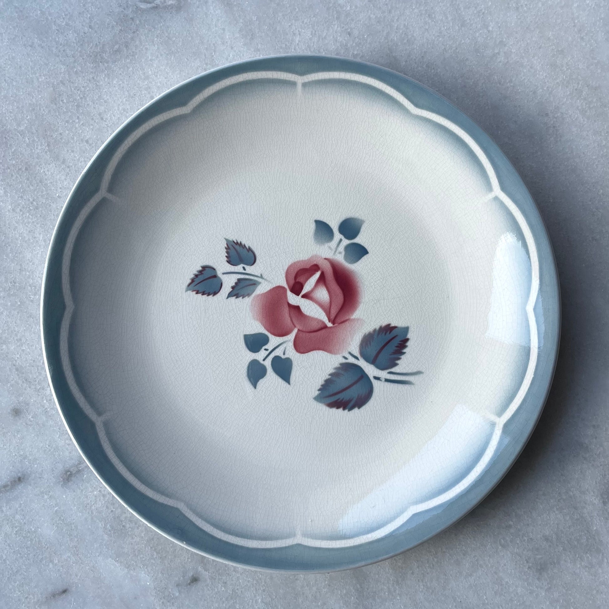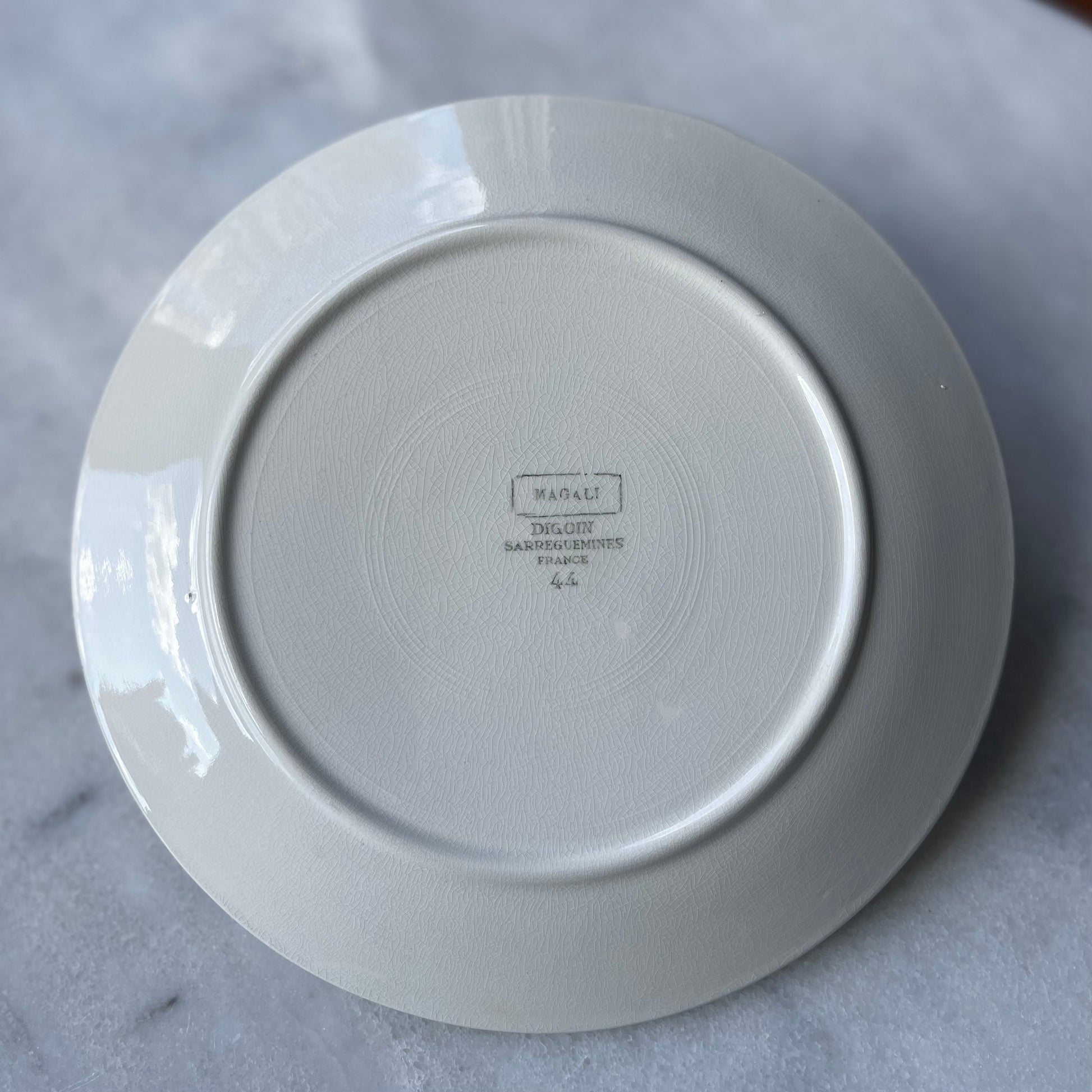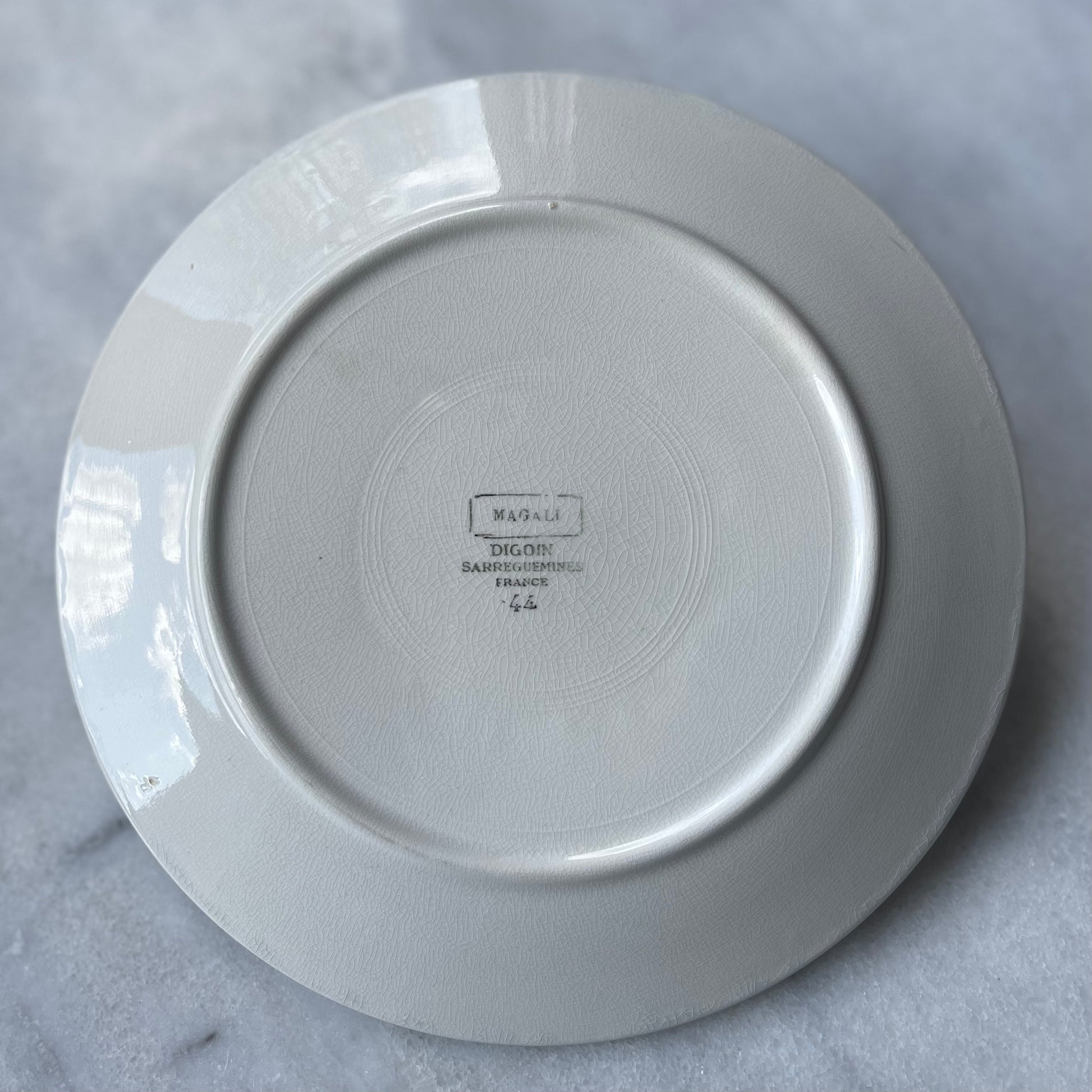 1940〜50年代のフランスでは、女性の名前をパターン名にした食器が多く出回っていたそうです。こちらのお皿のパターン名である<マガリ(Magali)>も、女の子の名前ですのでそのあたりの年に製作されたのかなと推測したりも致しますが、バックスタンプは1922年から1900年代半ばまで使われていたものですので、作られてから少なくとも70年は経過していと考えてよさそうです。