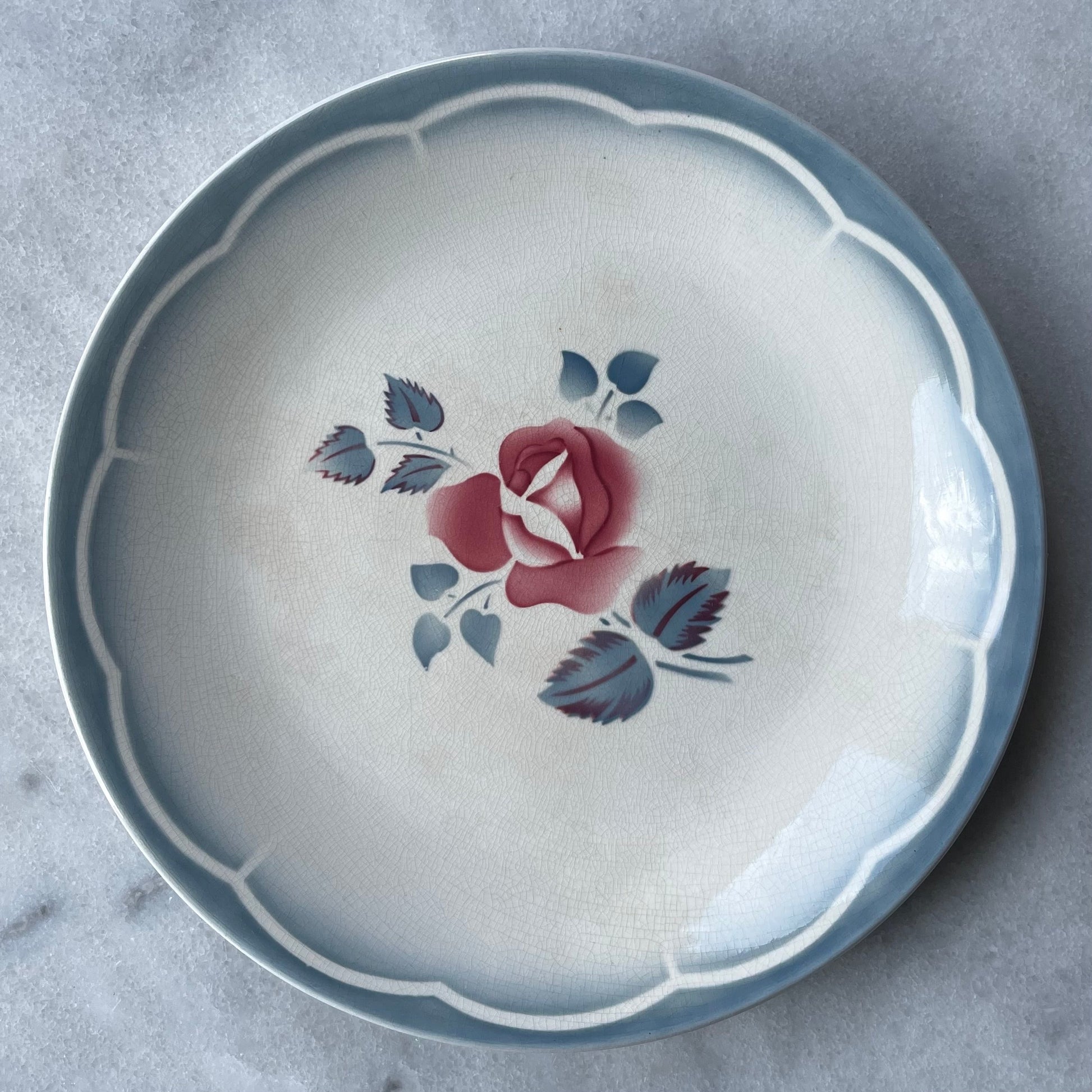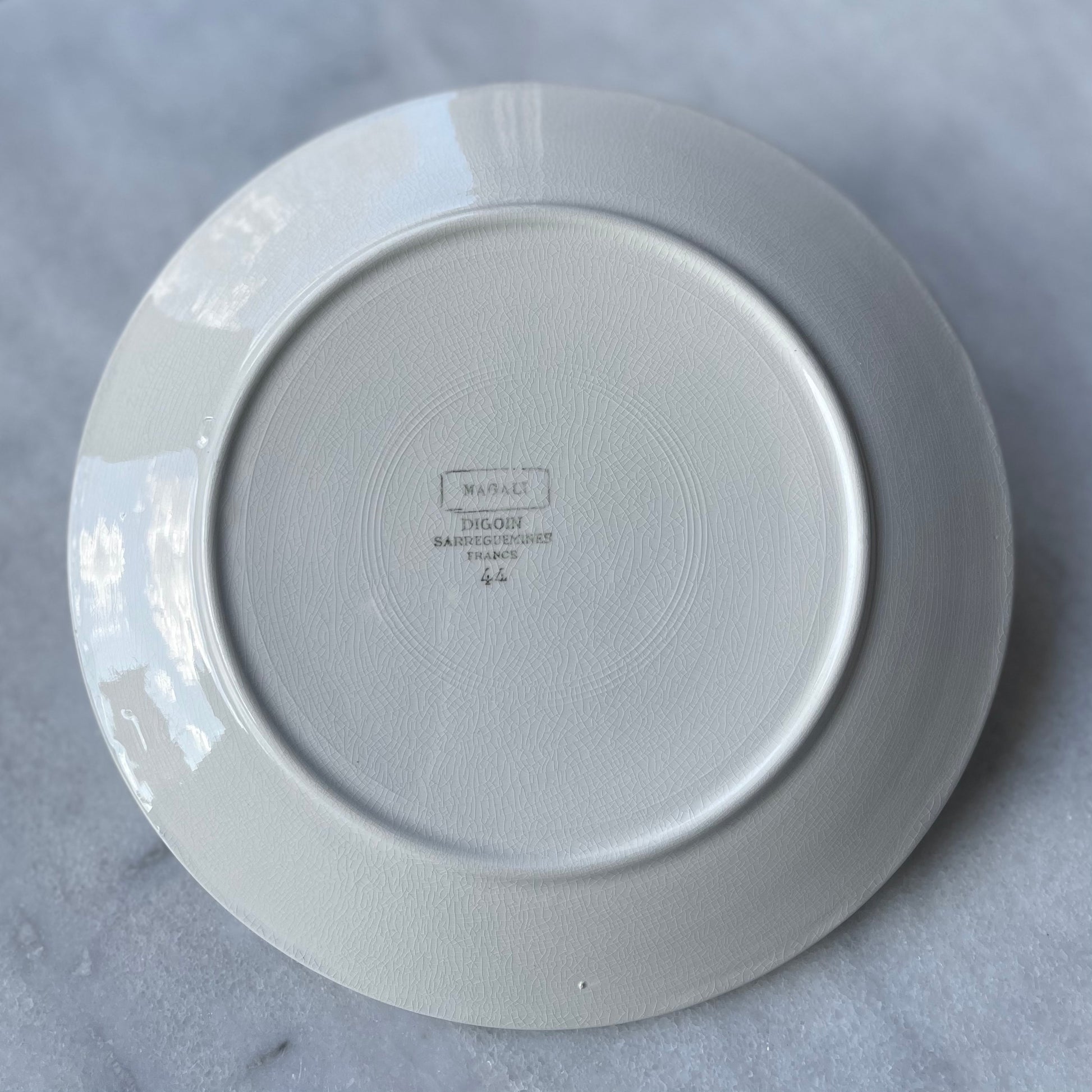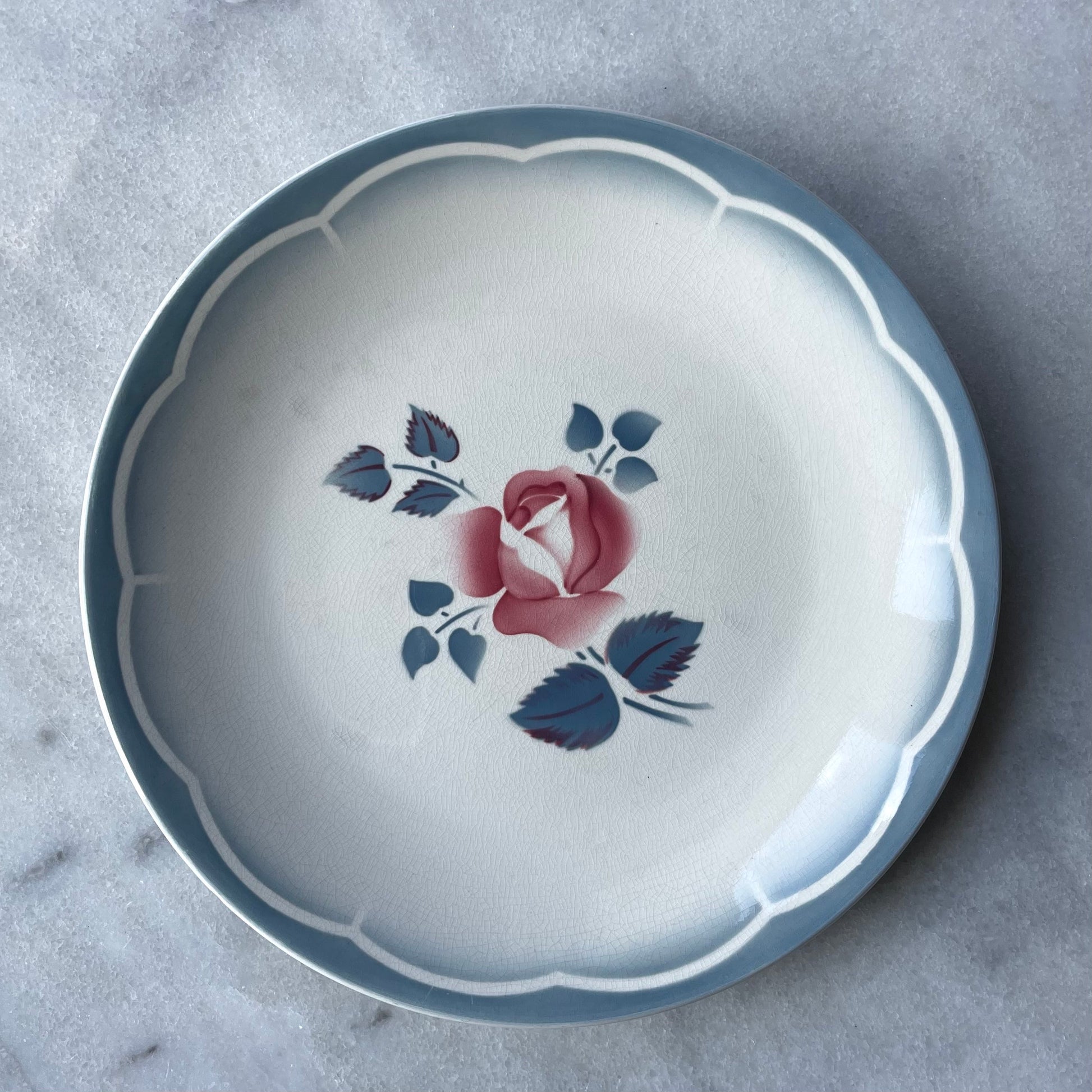 1940〜50年代のフランスでは、女性の名前をパターン名にした食器が多く出回っていたそうです。こちらのお皿のパターン名である<マガリ(Magali)>も、女の子の名前ですのでそのあたりの年に製作されたのかなと推測したりも致しますが、バックスタンプは1922年から1900年代半ばまで使われていたものですので、作られてから少なくとも70年は経過していと考えてよさそうです。