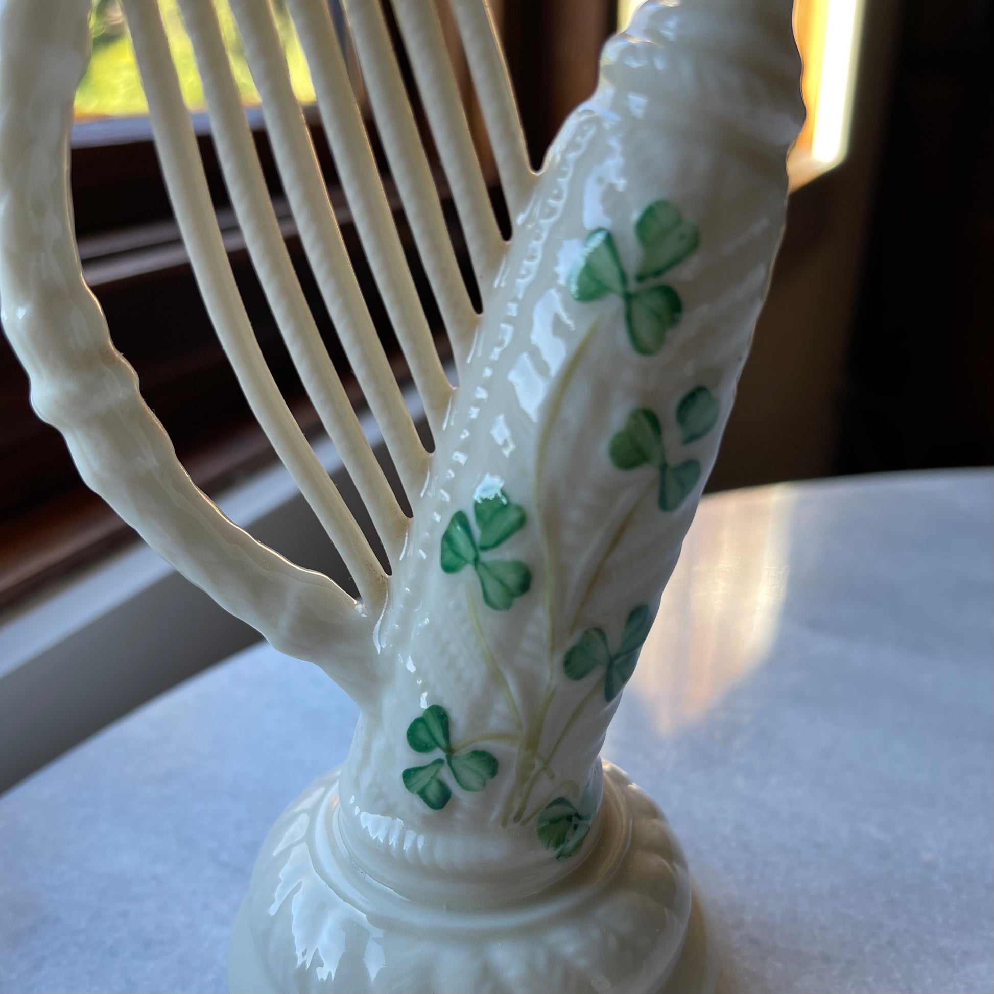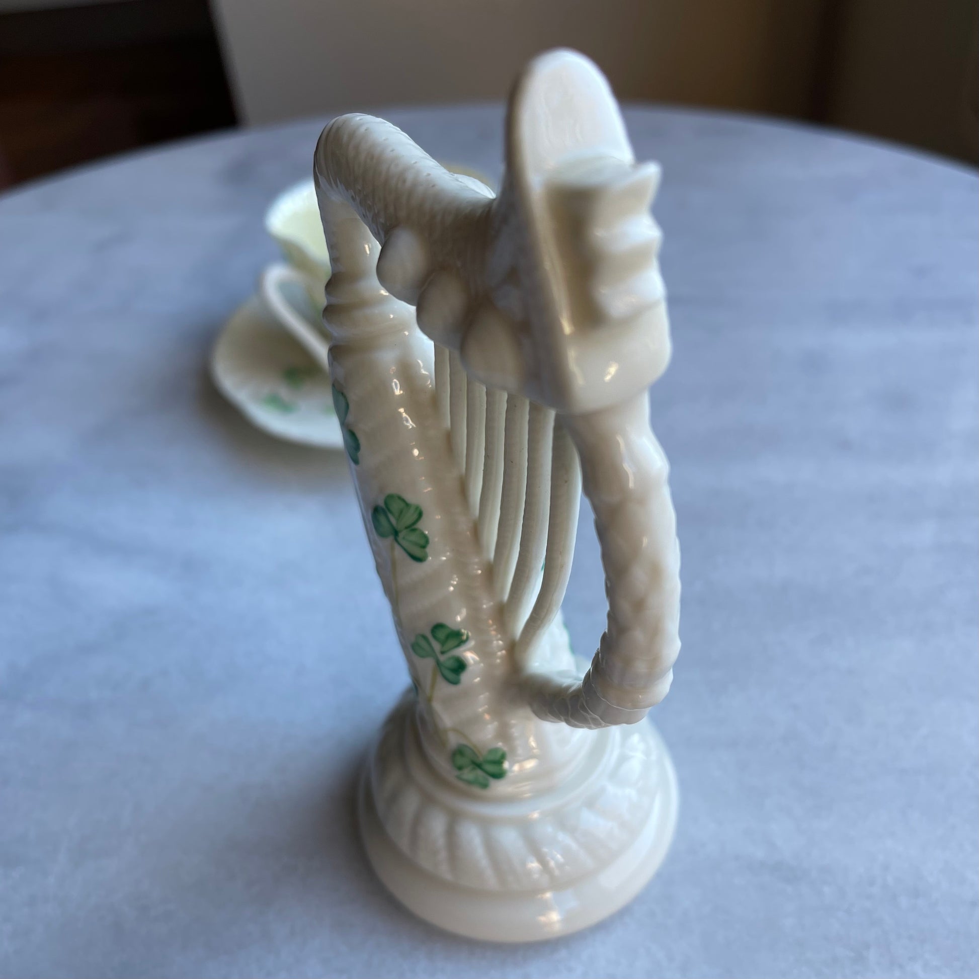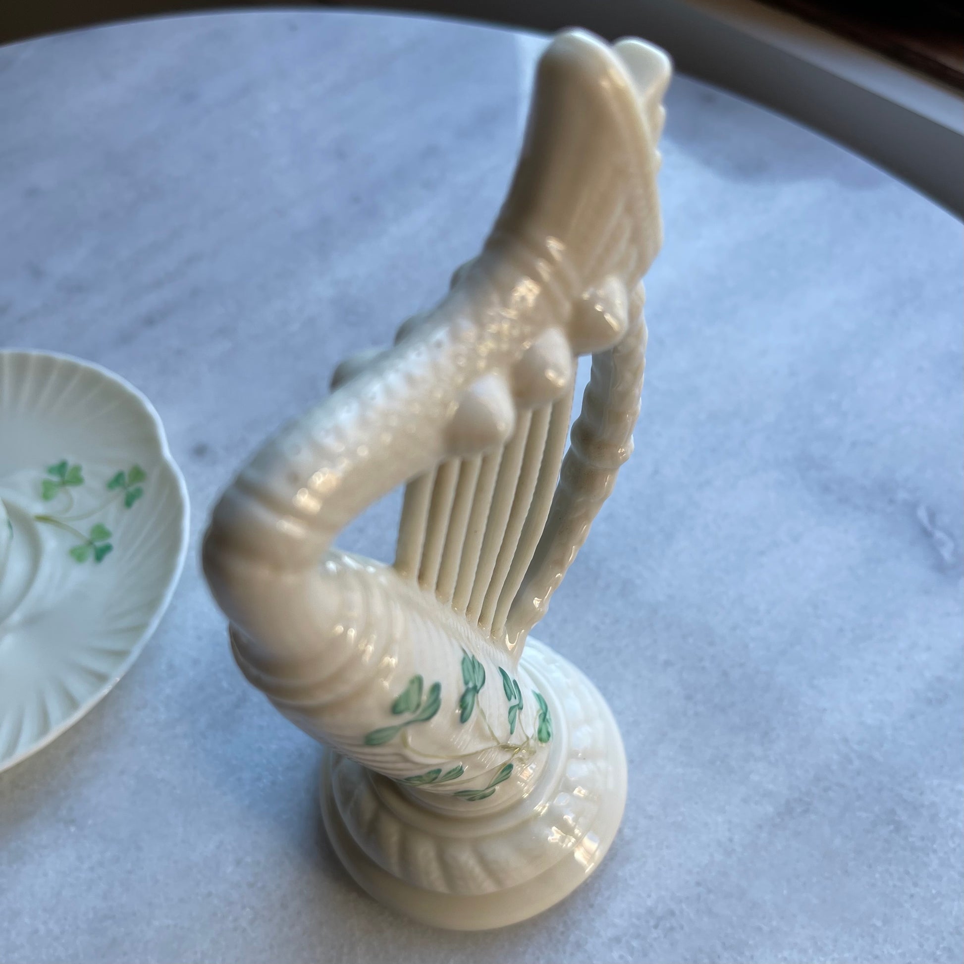 アイルランドの名窯ベリークのクラシック柄、シャムロックが手描きで施されたアイリッシュハープの置物です。