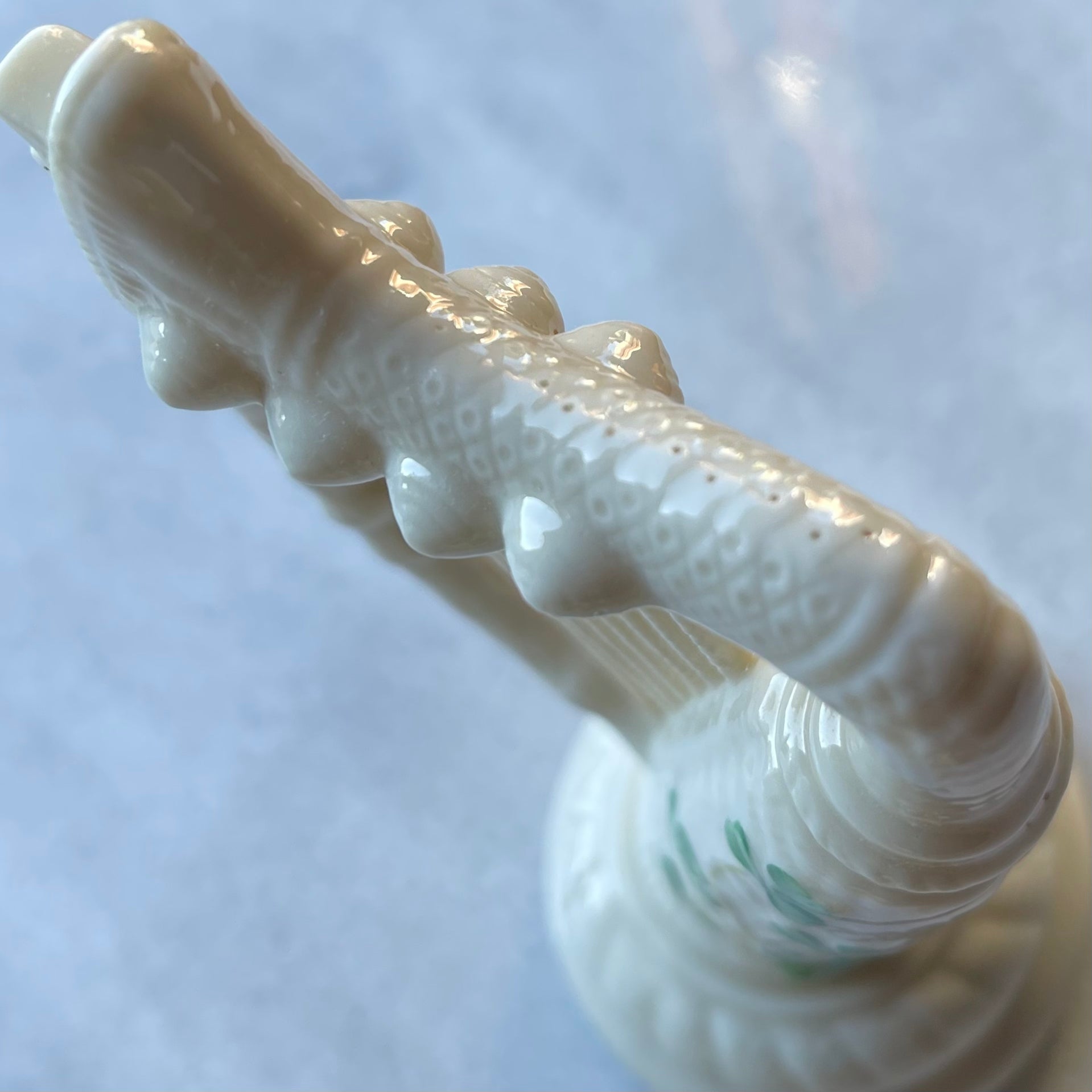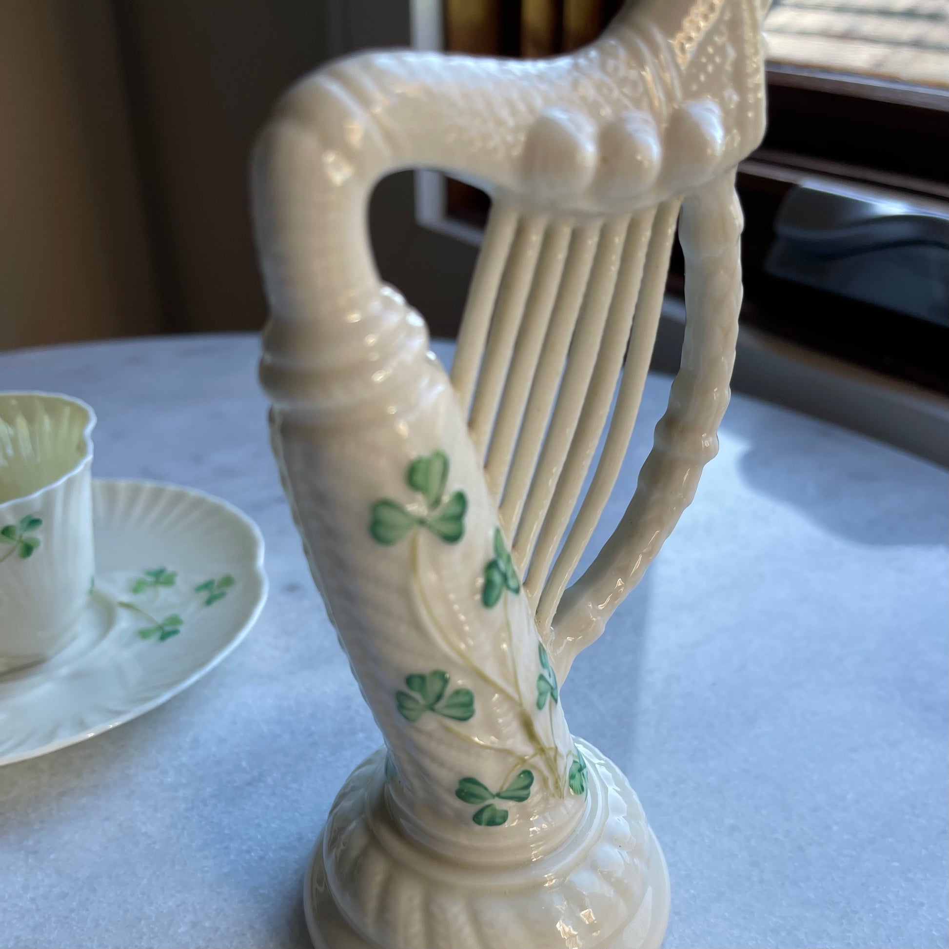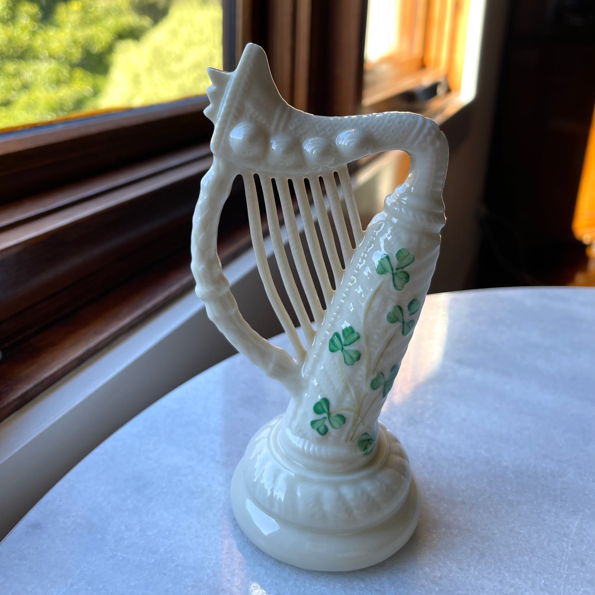 アイルランドの名窯ベリークのクラシック柄、シャムロックが手描きで施されたアイリッシュハープの置物です。