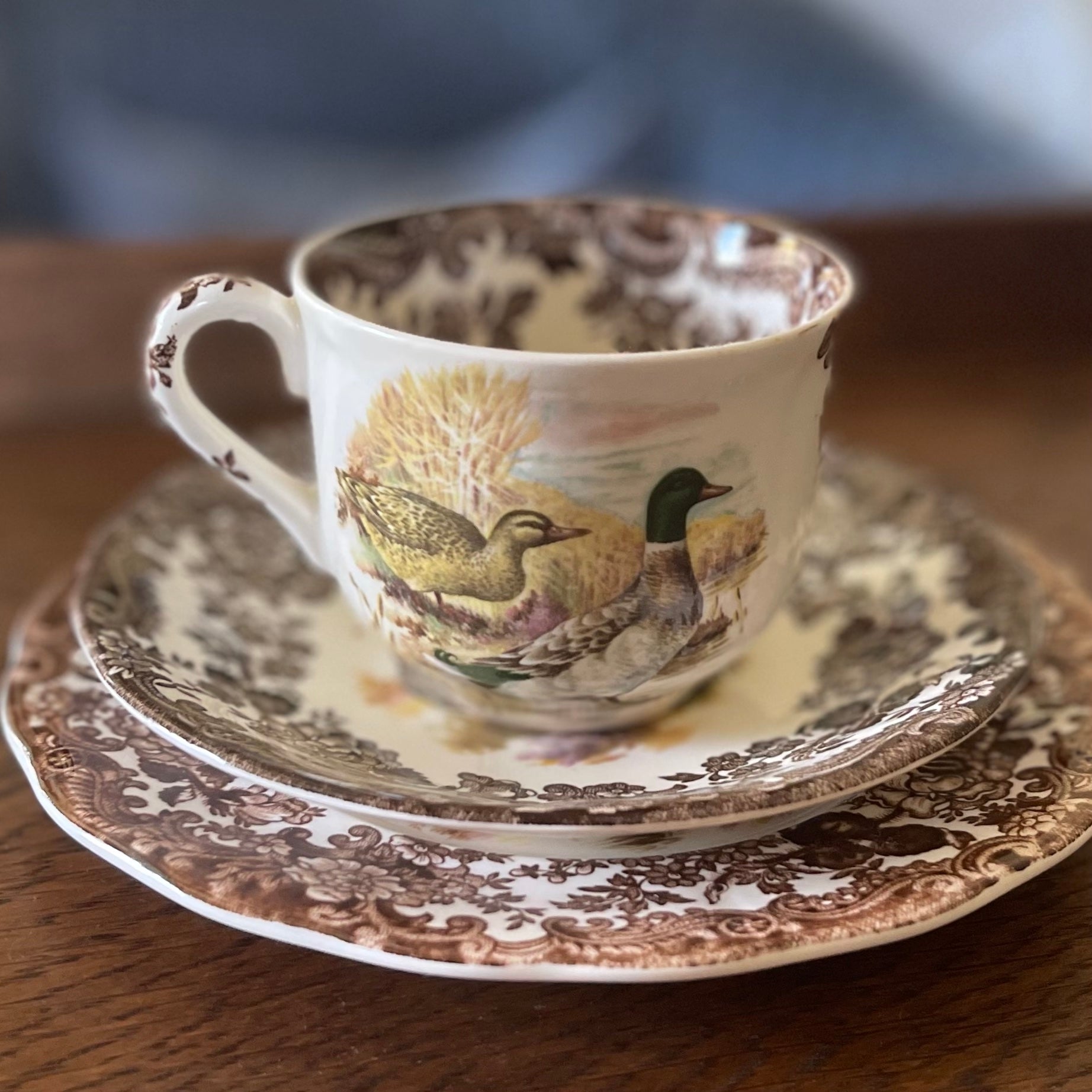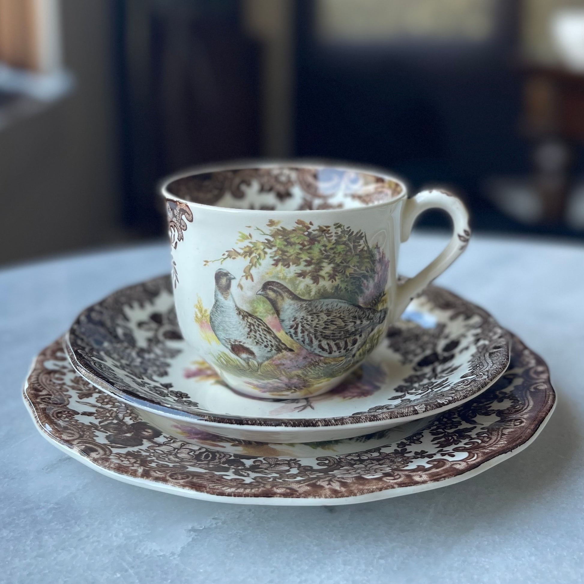 パリッシー窯作『ゲームシリーズ』の、中心にウズラの絵が手塗りで施された陶器カップ、ソーサー、サイドプレートを買い付けましたので、トリオとしてご紹介させてください。コップは、ウズラの反対側に鴨の絵も描かれています。