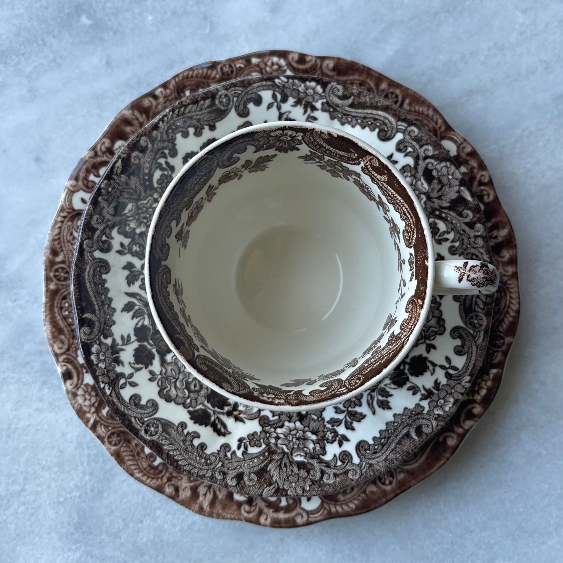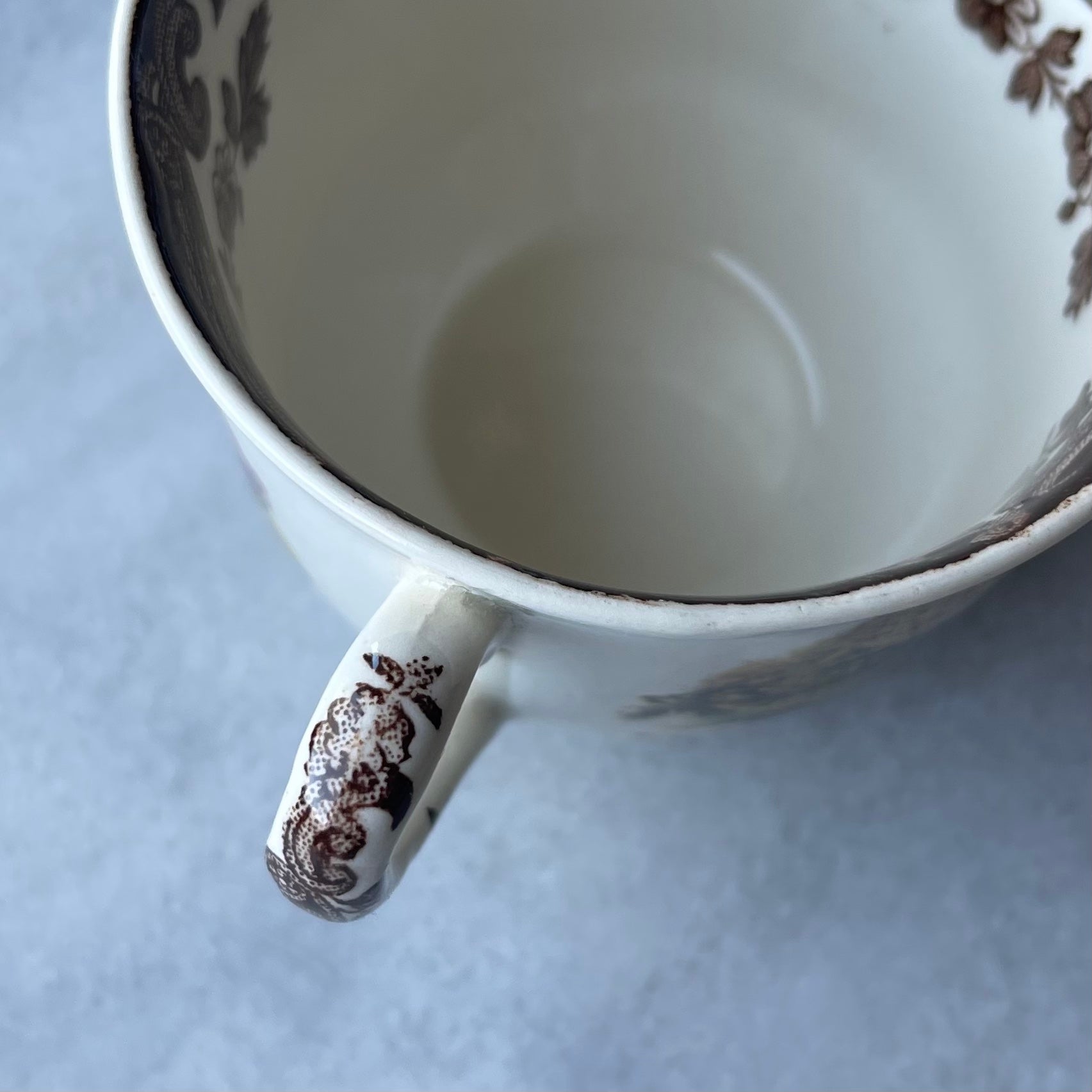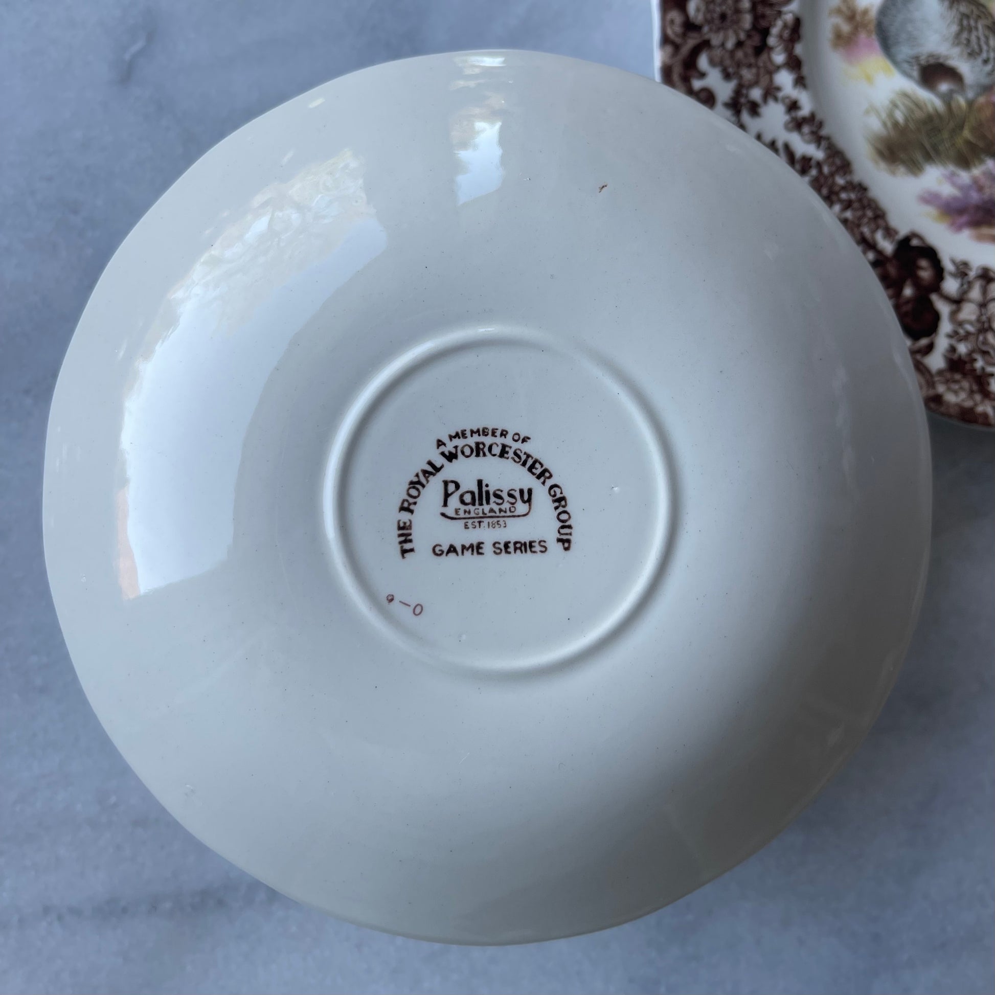 そもそも『ゲーム』とは、狩猟の対象になる野生の鳥獣類の総称で、エドワード朝に特に好んで用いられたモチーフだったようです。ロイヤルウースター博物館のウェブサイトによると、ディナーのメニューに度々ゲームの食肉、所謂ジビエが登場し、さらには食材にマッチしたテーブルウェアーを一式揃えてしまうという当時の富裕層の趣向を反映したモチーフだったそう。実際にこちらのお品が作られたのは、パリッシー窯を買収したロイヤルウースターが更に他の会社に買収された後ですので、もっと最近の話なのですが、ここ半年ほどパリッシーのシリーズを仕入れるべく色んな方のお話を聞く機会がございまして、如何にこのゲームシリーズが高価なものだったかを知る良いきっかけとなりました。なぜ高価って、そもそもこちらのシリーズを、多くの方々が6人用、もしくは12人用のディナーセットとしてご購入されていたからという背景もございます。