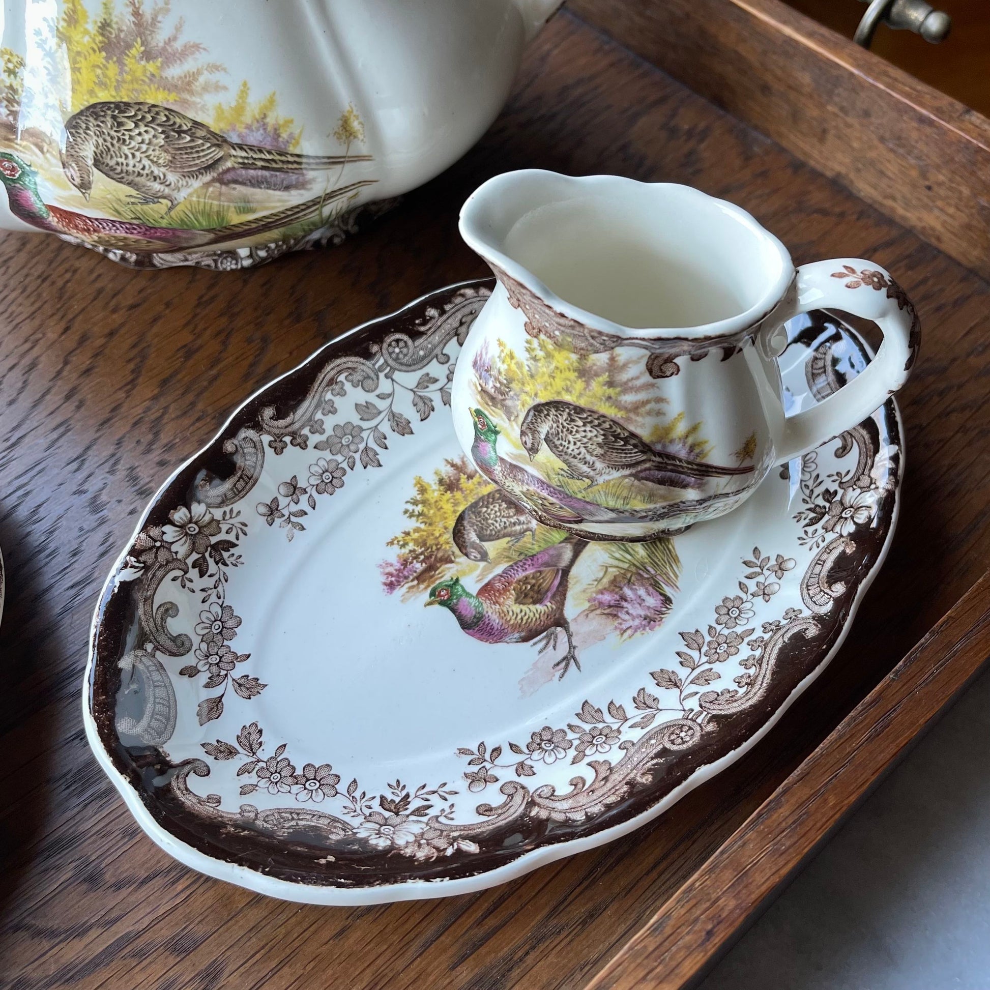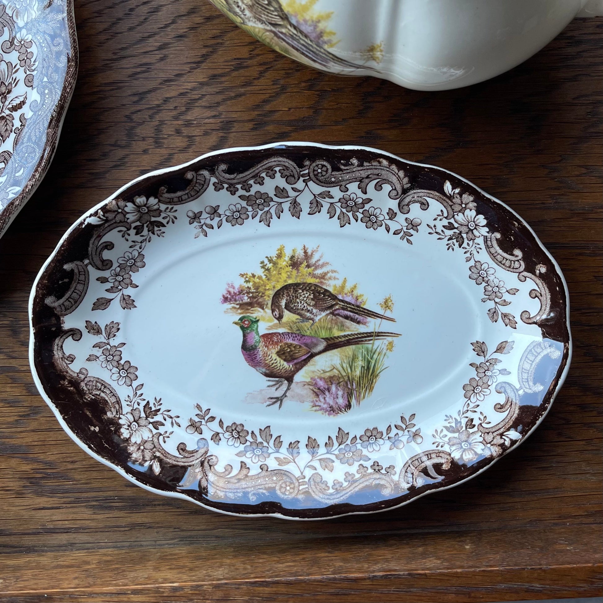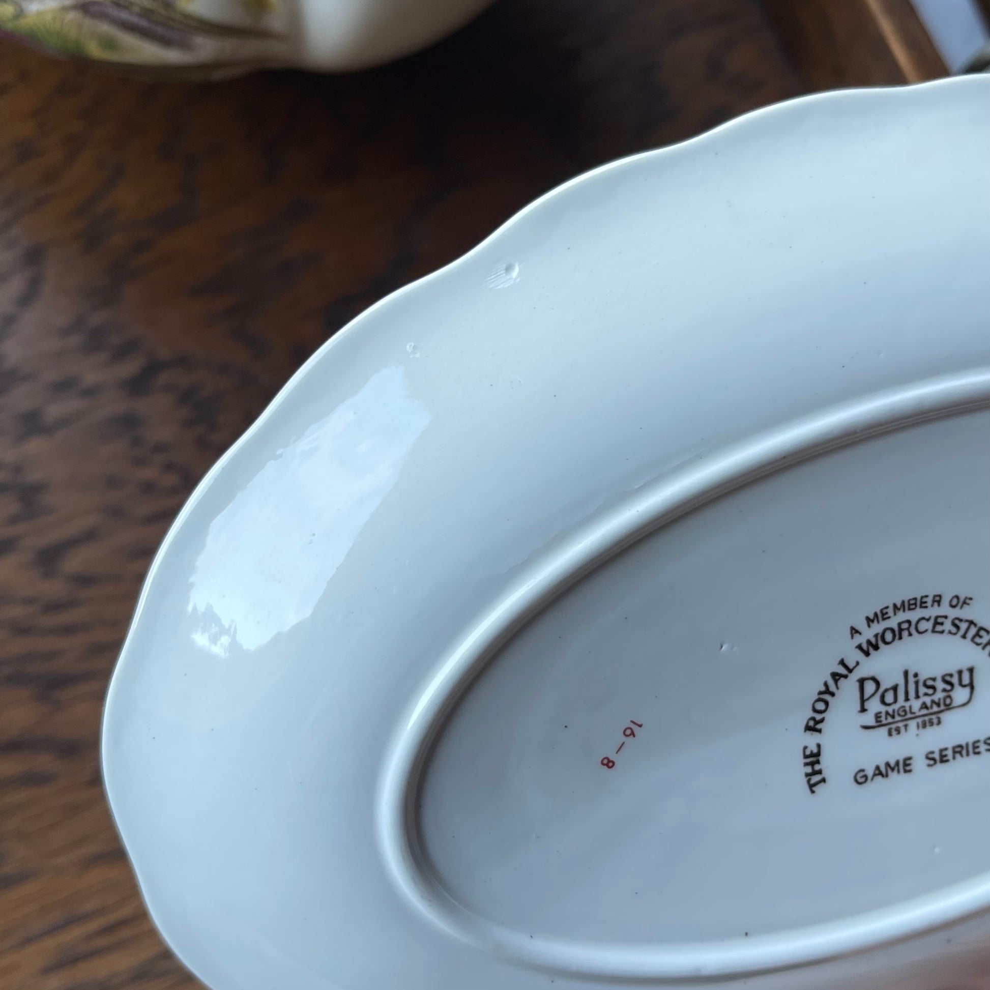 <オーバル型ソーサー> 元はソースジャグに添えられたソーサーだったのかもしれません。ちょっとしたお菓子を乗せていただいたり、カップと一緒にテニスセットとしてご利用いただいたり、色々と使い道がありそうです。中心には雉が描かれています。転写の施された縁取り部分に、製作時のものと思われる色抜け、色飛びなどがございますが、使用感もほぼなく、非常に綺麗なお品です。