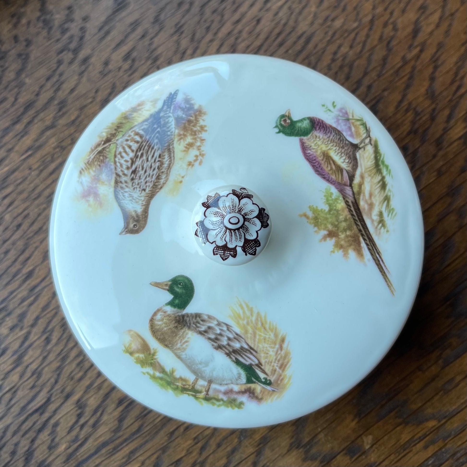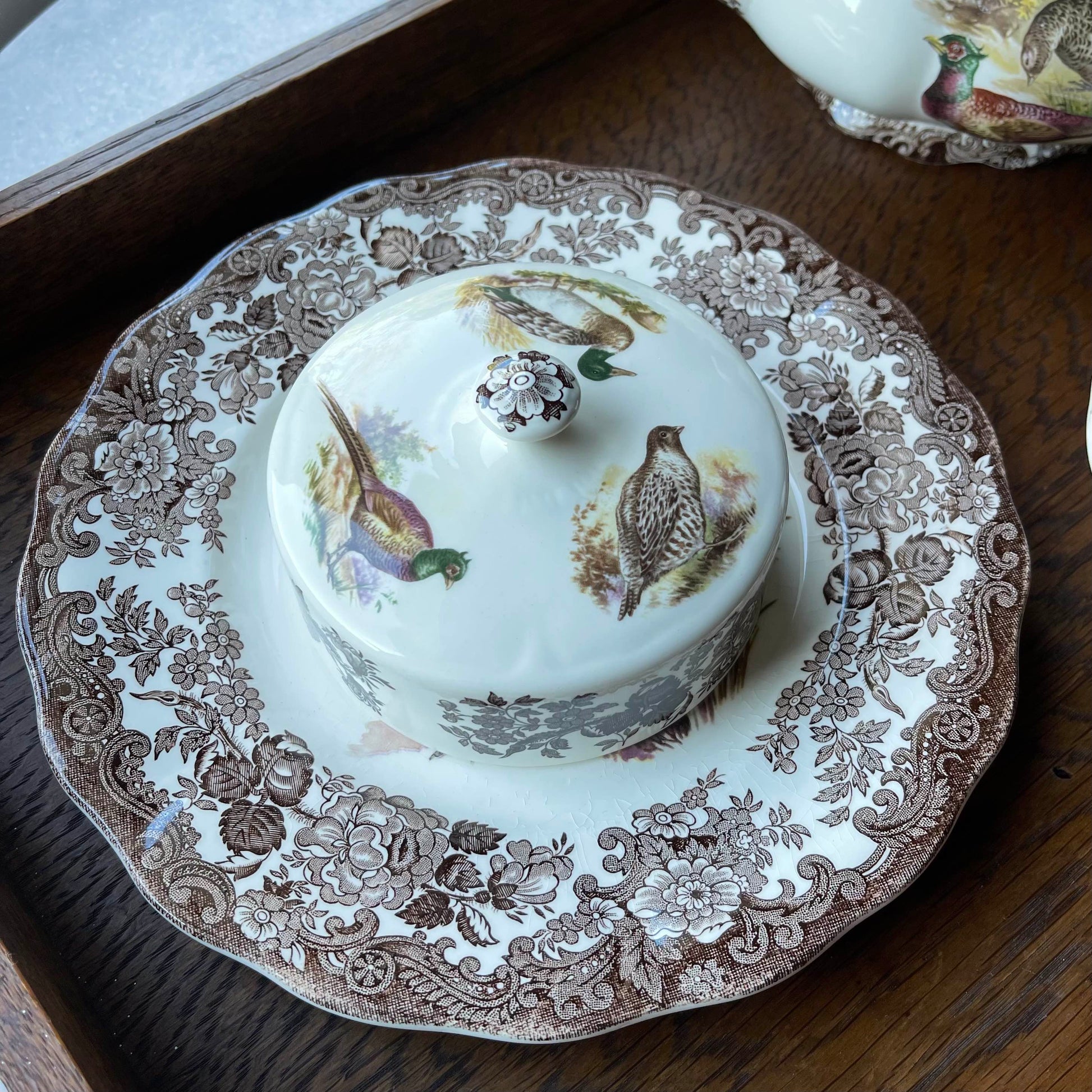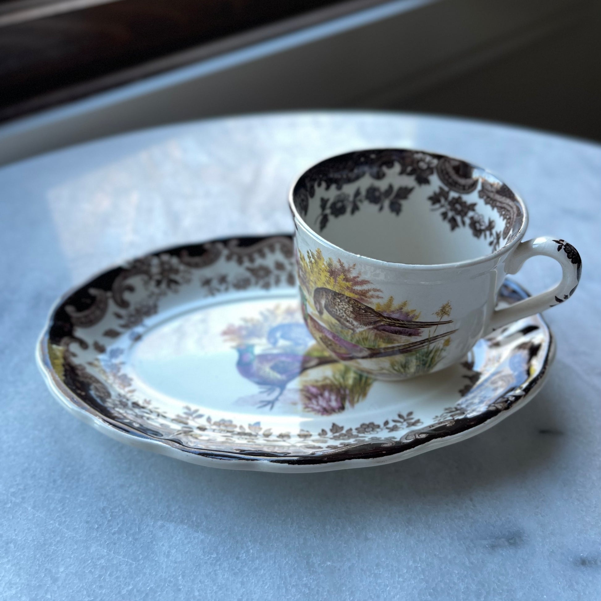 <オーバル型ソーサー> 元はソースジャグに添えられたソーサーだったのかもしれません。ちょっとしたお菓子を乗せていただいたり、カップと一緒にテニスセットとしてご利用いただいたり、色々と使い道がありそうです。中心には雉が描かれています。転写の施された縁取り部分に、製作時のものと思われる色抜け、色飛びなどがございますが、使用感もほぼなく、非常に綺麗なお品です。