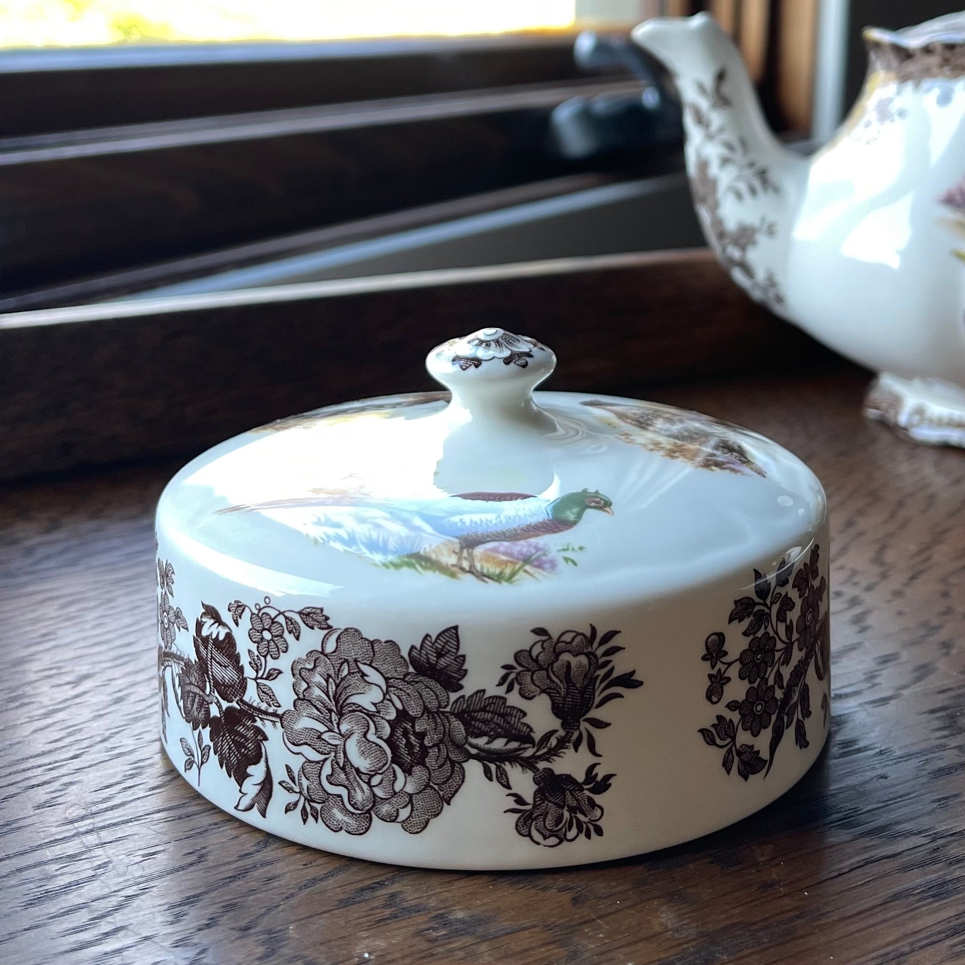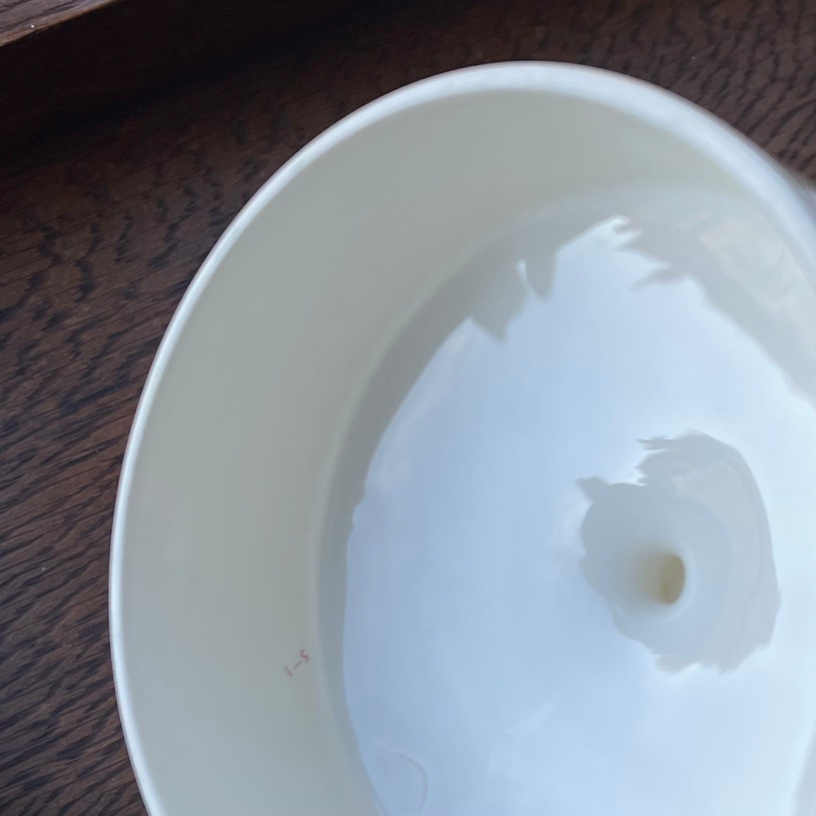 <バター容器の蓋のみ> 残念ながら受け皿は無かったのですが、プレートに小さな個包装のお菓子だったり、食後のチョコレートやチーズなどを盛っていただいた上から被せてクロッシュとしてお使いいただくのもありかしらと考えながらショップに持ち帰ってまいりました。サイズ感をお伝えしたく、偶々手元にございましたデザートプレートに乗せて撮影いたしておりますが、写真を見る限り元々の受け皿は、こちらより一回り小さなパン皿・サイドプレート(17〜8cm位)サイズかと思われます。内側に小さく1箇所、釉薬のかかっていない部分がありますが、カケ、ヒビ、貫入も見受けられず新品のように綺麗なお品です。