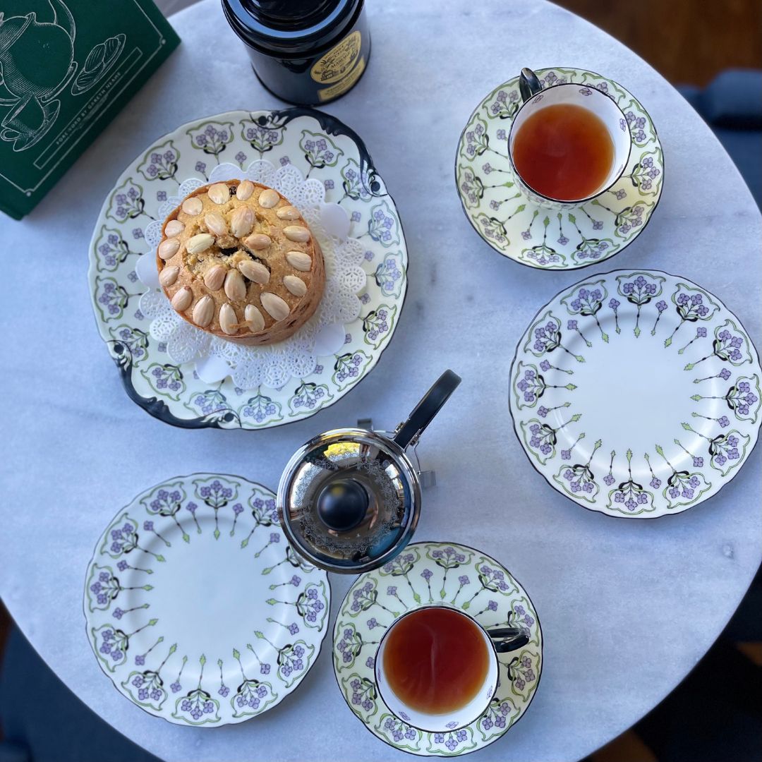 カップ内部はボーンチャイナの白く透き通ったお色です。カップの外側及びソーサーは、経年によるものかどうかは定かではありませんが、釉が日焼けをしたようなクリーム色をしています。縁取りのマットブラックと相まって、燻銀やピューター製のトレイなど合わせられても渋さが際立つかもしれません。