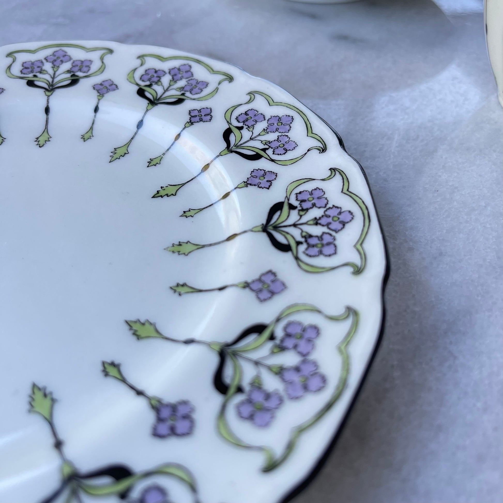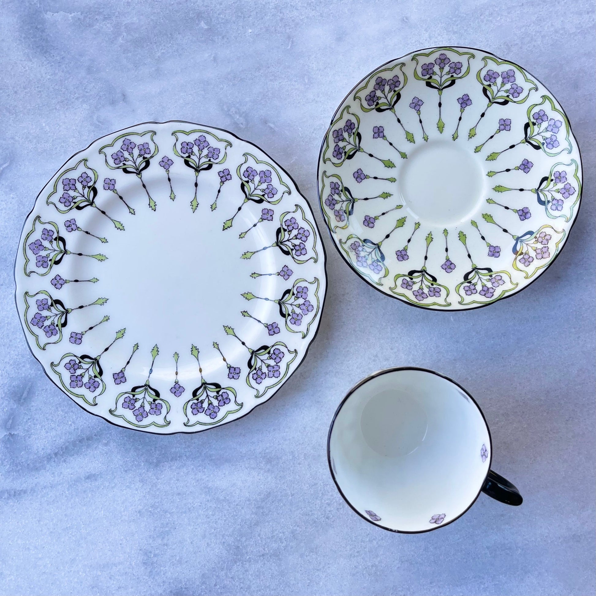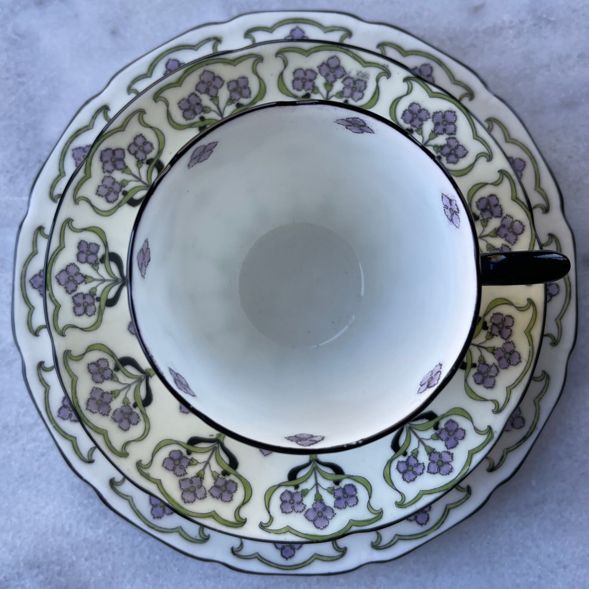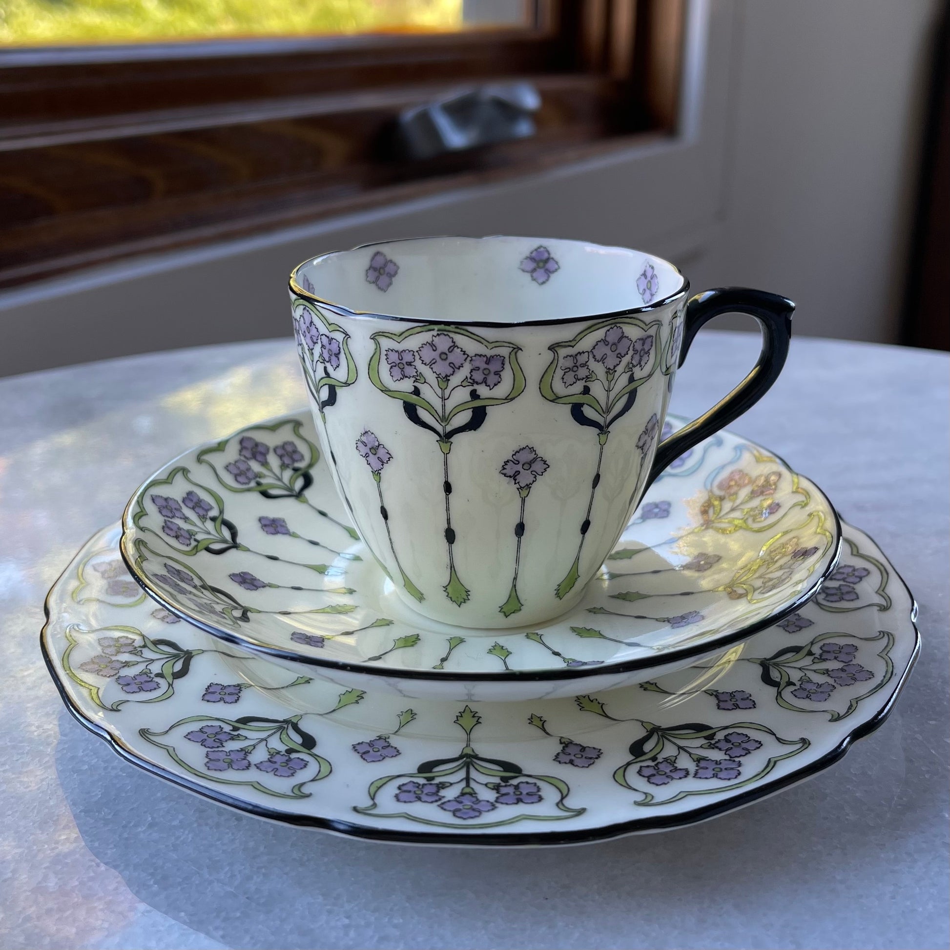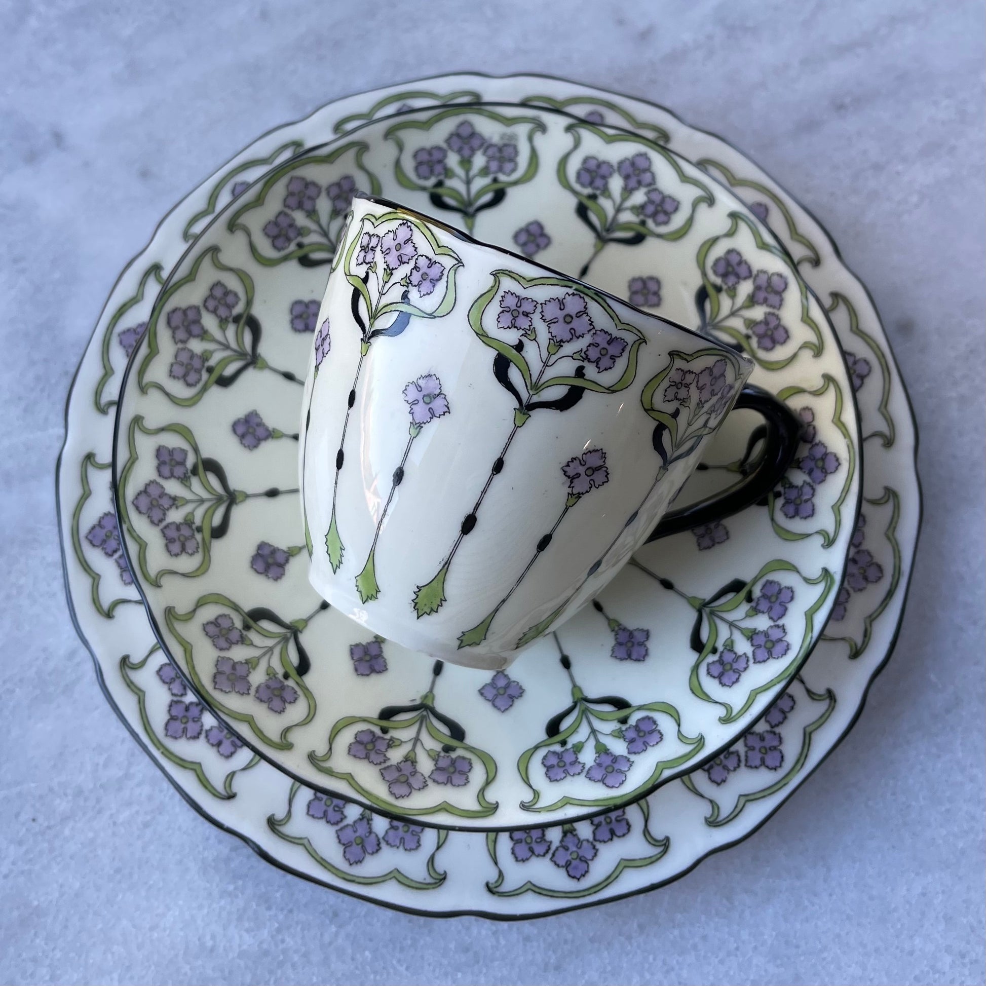 ハロッズ、サヴォイ、セルフリッジズなど、ロンドンの名だたる建築物の内装建材やタイル、装飾を手掛けたことでも知られるロイヤルドルトンの、アール・ヌーヴォー様式パターンの施されたアンティークトリオです。