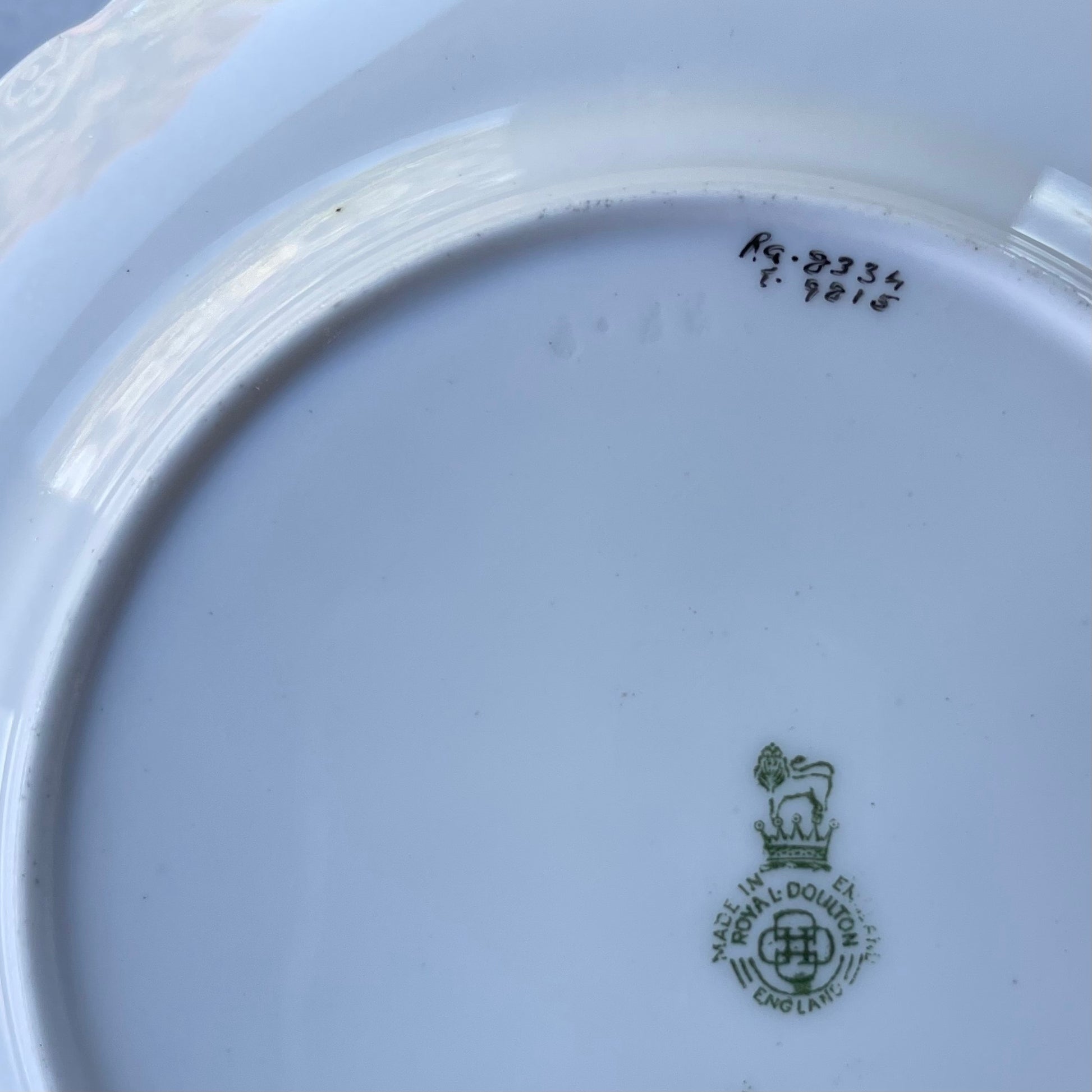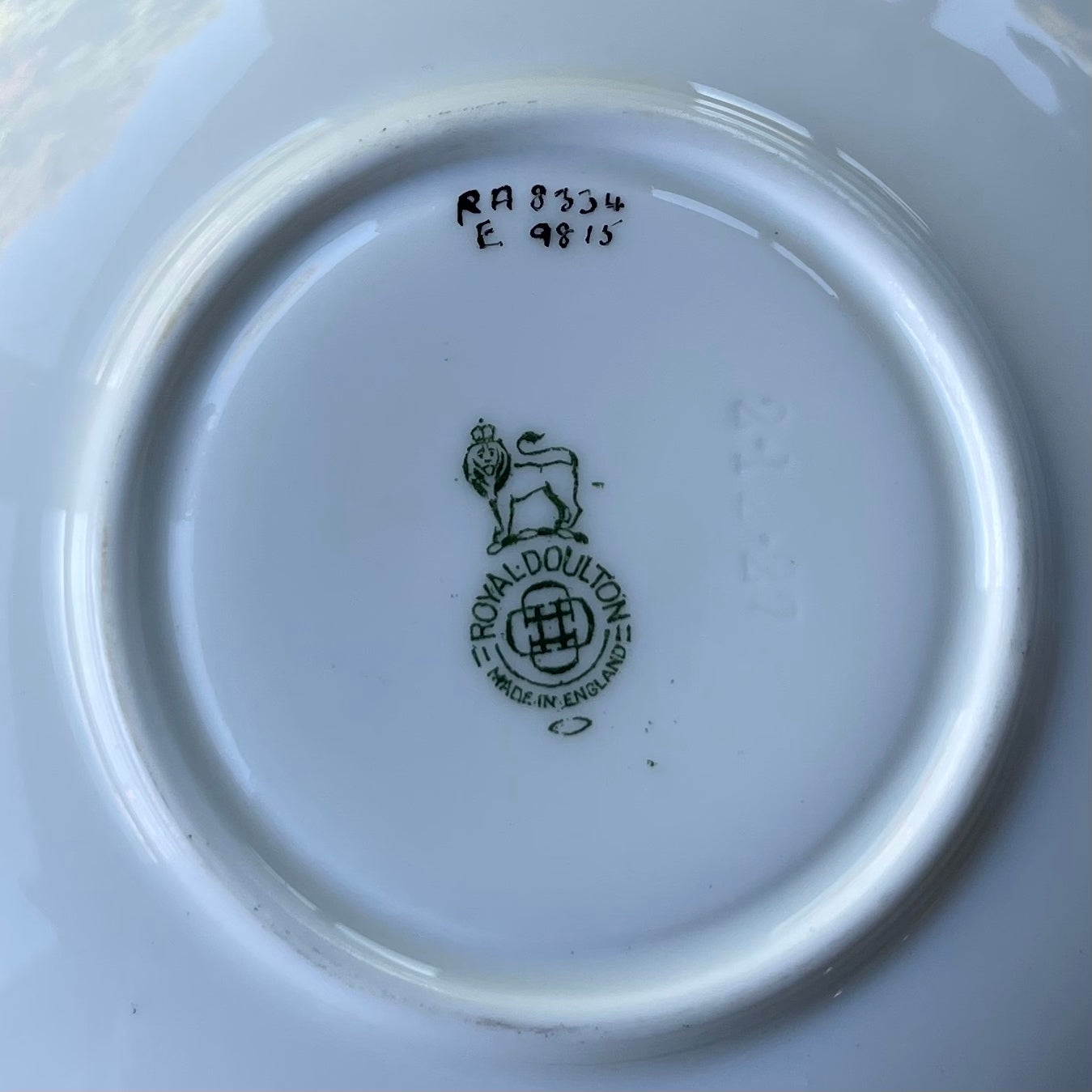 当時のドルトンのディレクターデザイナー、ロバート・アラン氏率いるペイント部署『ロバートアランスタジオ』が出がけた作品であることを示すRA番号が入っています。その番号から遡って調べると、こちらのデザインが発表されたのは1914年。実際のお品にはソーサーとサイドプレートにデートコードも刻まれていますが、少々見難く、カップ及びソーサーは恐らく1922年製造かと推測いたします。サイドプレートの製造年はそれとは異なるかもしれません。