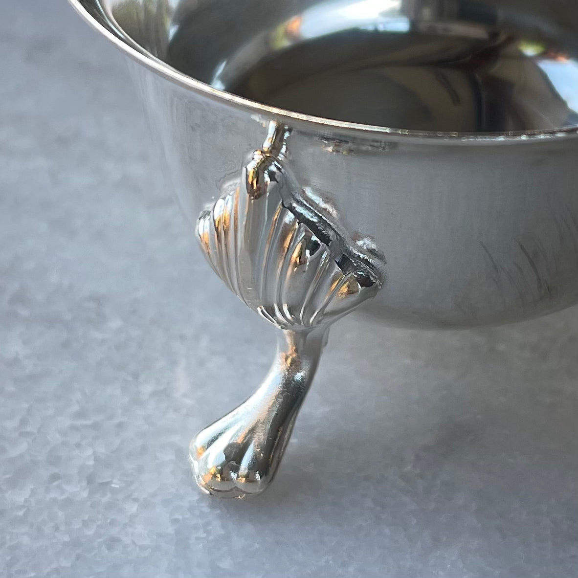 ストレーナーの持ち手部分や淵部分のデザインも優美ですが、最初に目を奪われたのはやはり受け皿スタンドの脚でございました。クイーンアン様式の家具にカブリオールと呼ばれる脚のスタイルがございますが、こちらのお品につきましては、その中でも<ドレーク(英語で雄のアヒルや鴨もことを指します)脚>に分類される3脚、3指です。