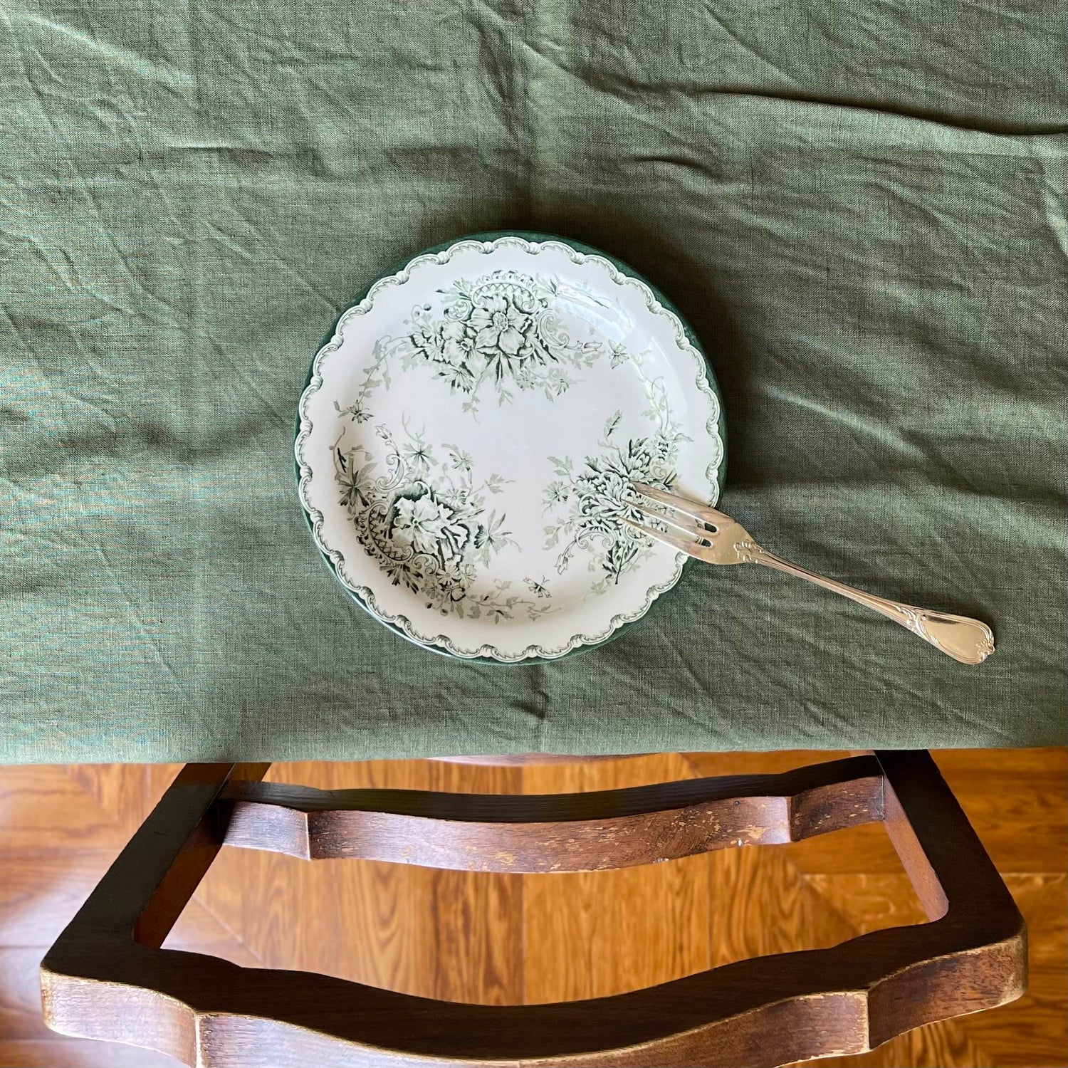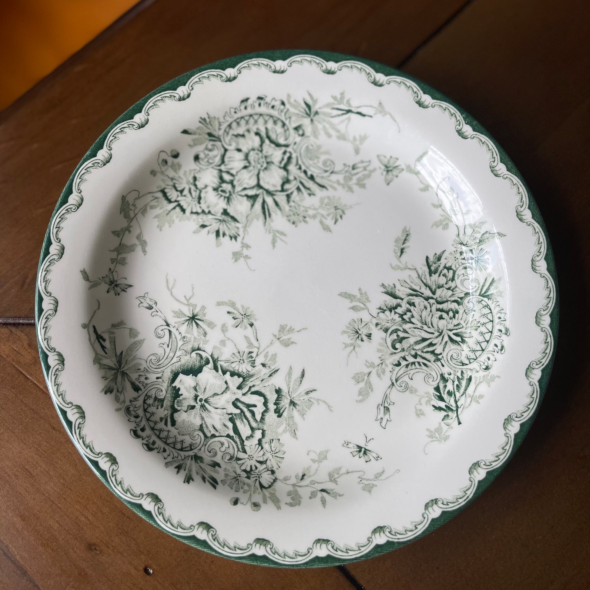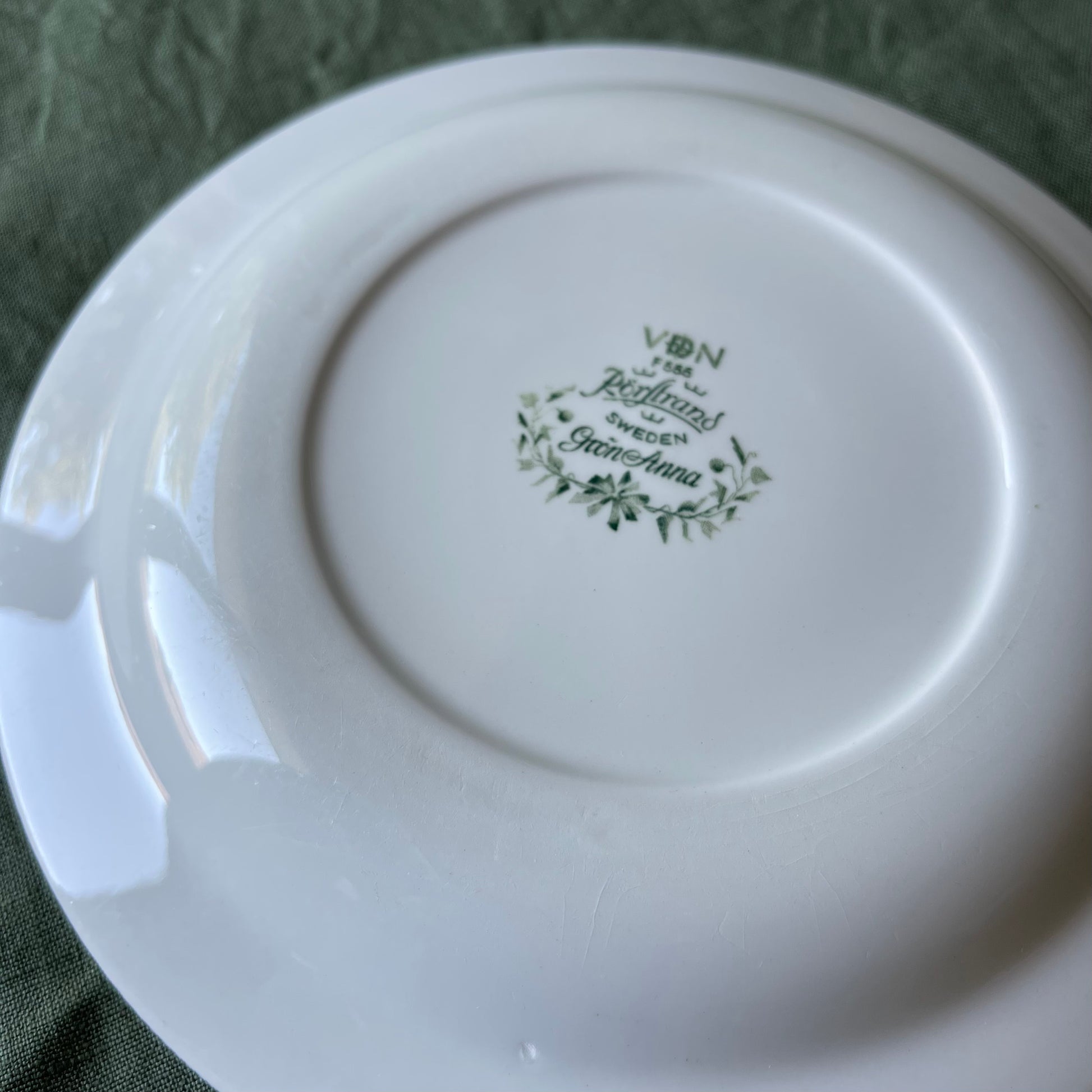 スウェーデンの老舗メーカーRörstrand製、Grön Annaシリーズの取り皿(assiett)です。落ち着いた萌葱色単色で描かれた草花や蝶の自然モチーフの古典柄が、シンプルなアンティーク調のテーブルを演出してくれそうです。