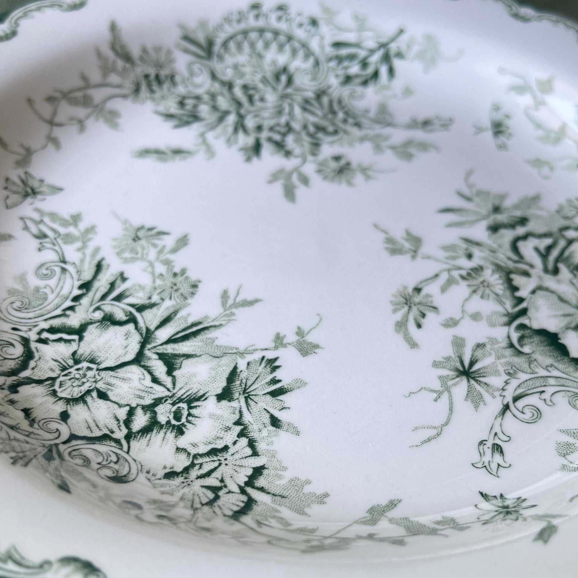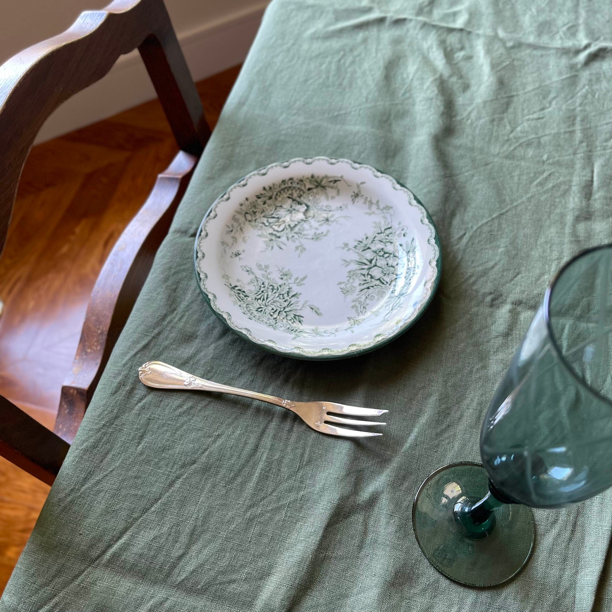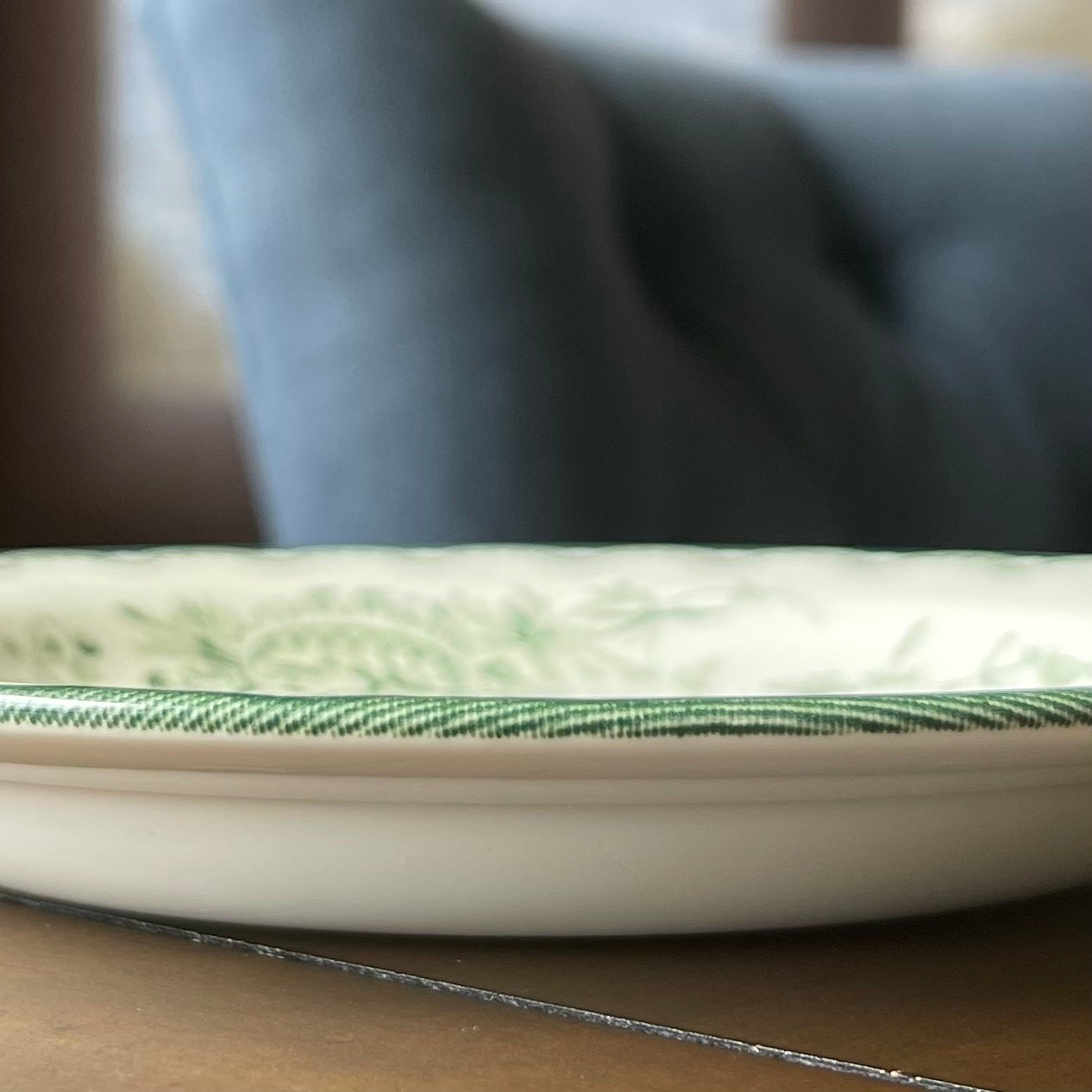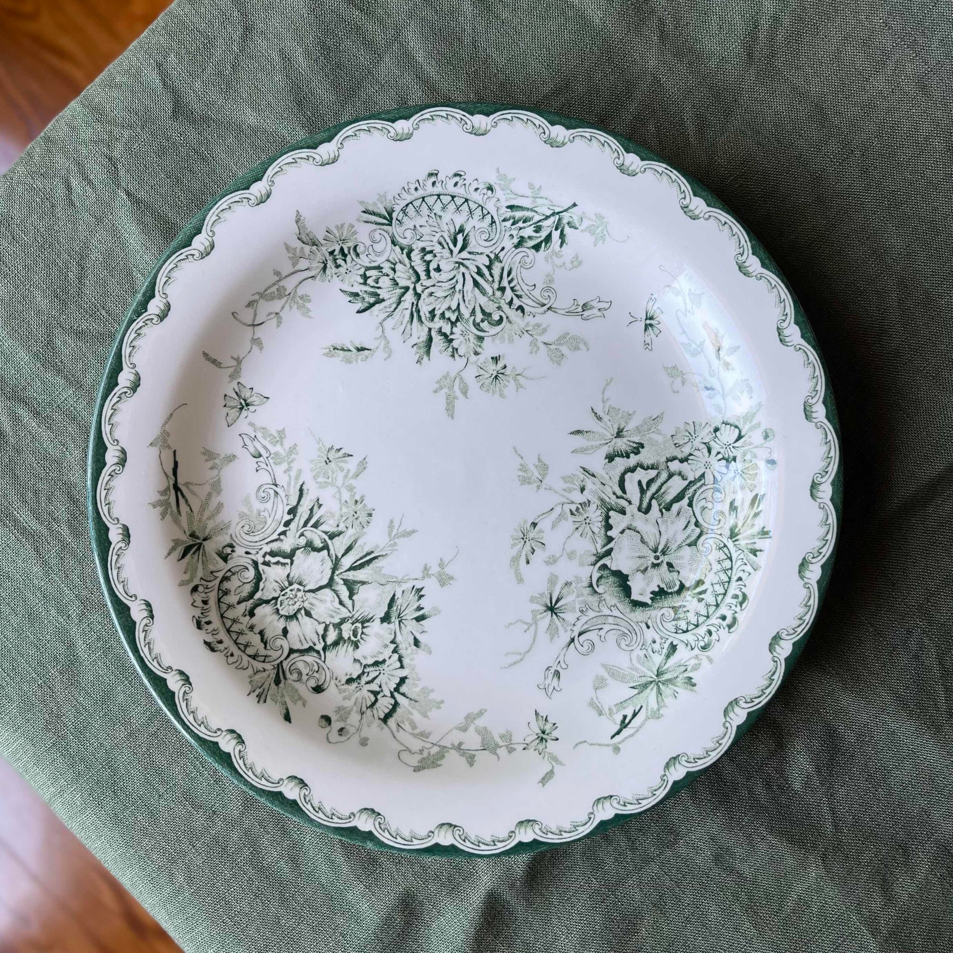 スウェーデンの老舗メーカーRörstrand製、Grön Annaシリーズの取り皿(assiett)です。落ち着いた萌葱色単色で描かれた草花や蝶の自然モチーフの古典柄が、シンプルなアンティーク調のテーブルを演出してくれそうです。