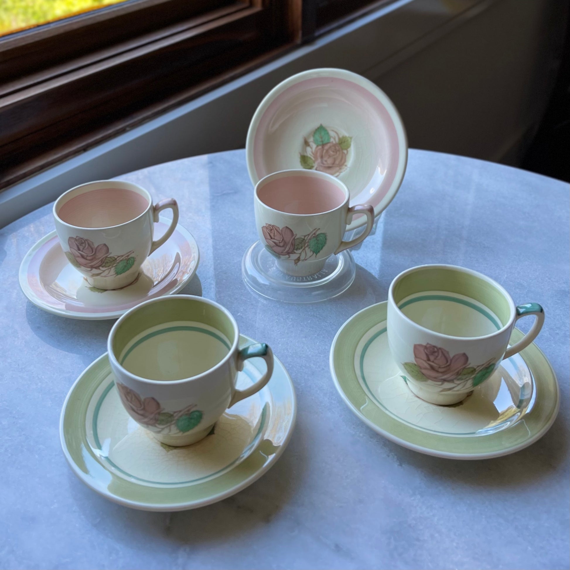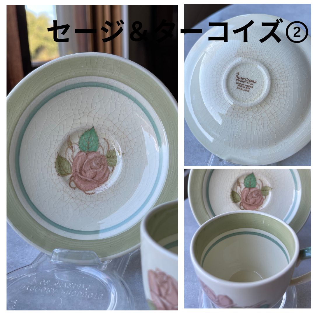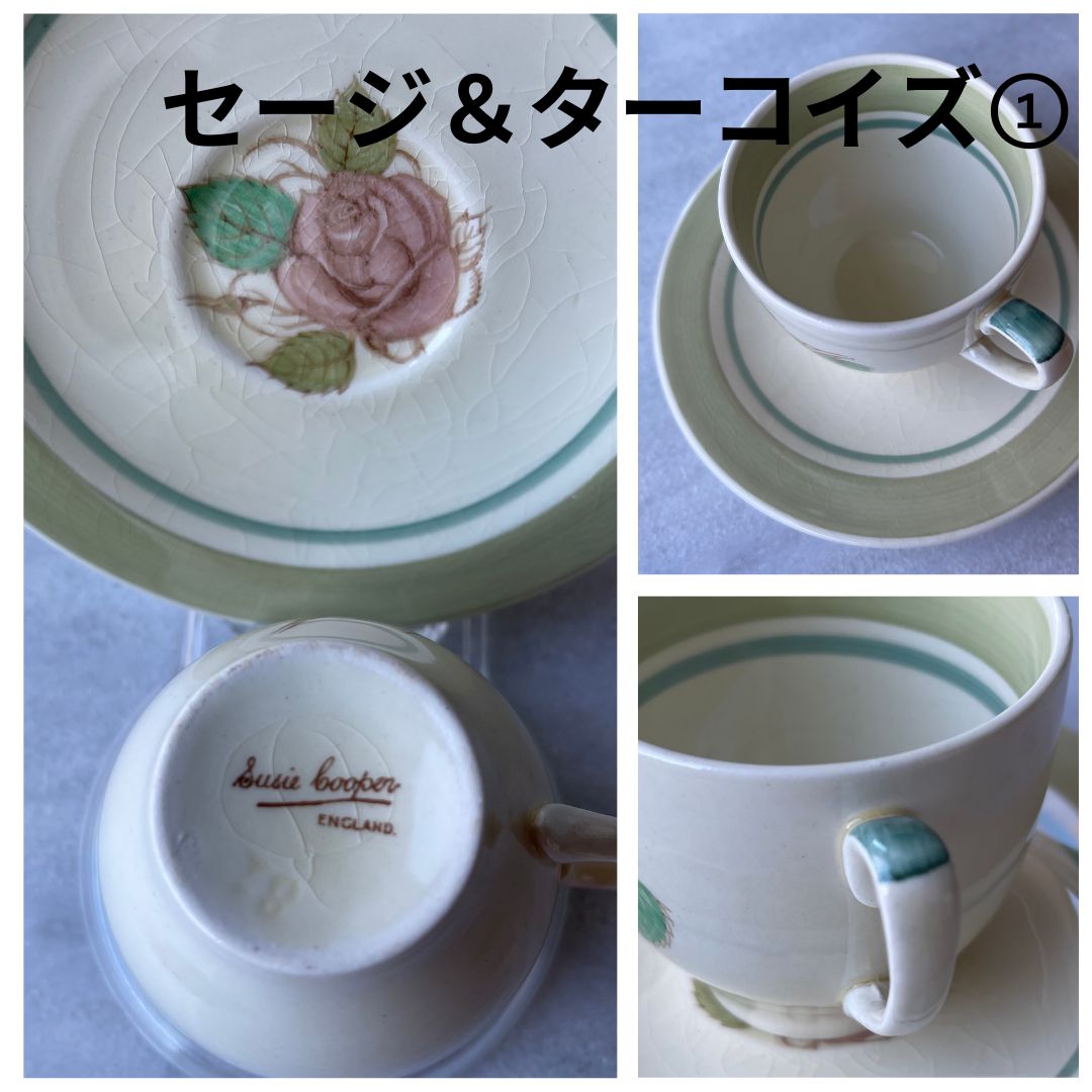 スージークーパーの人気パターン、<パトリシアローズ>のデミタスカップとソーサーのデュオです。ピンクウォッシュボーダーのパターンのデュオが2客、カップの内側ソーサーともにセージ色のボーダーとターコイズ色の細いラインが入ったパターンのデュオが2客、合わせまして4客が入荷致しております。ピンクの方はただただ可愛らしく、セージ&ターコイズはスタイリッシュでもありキュートな佇まいです。