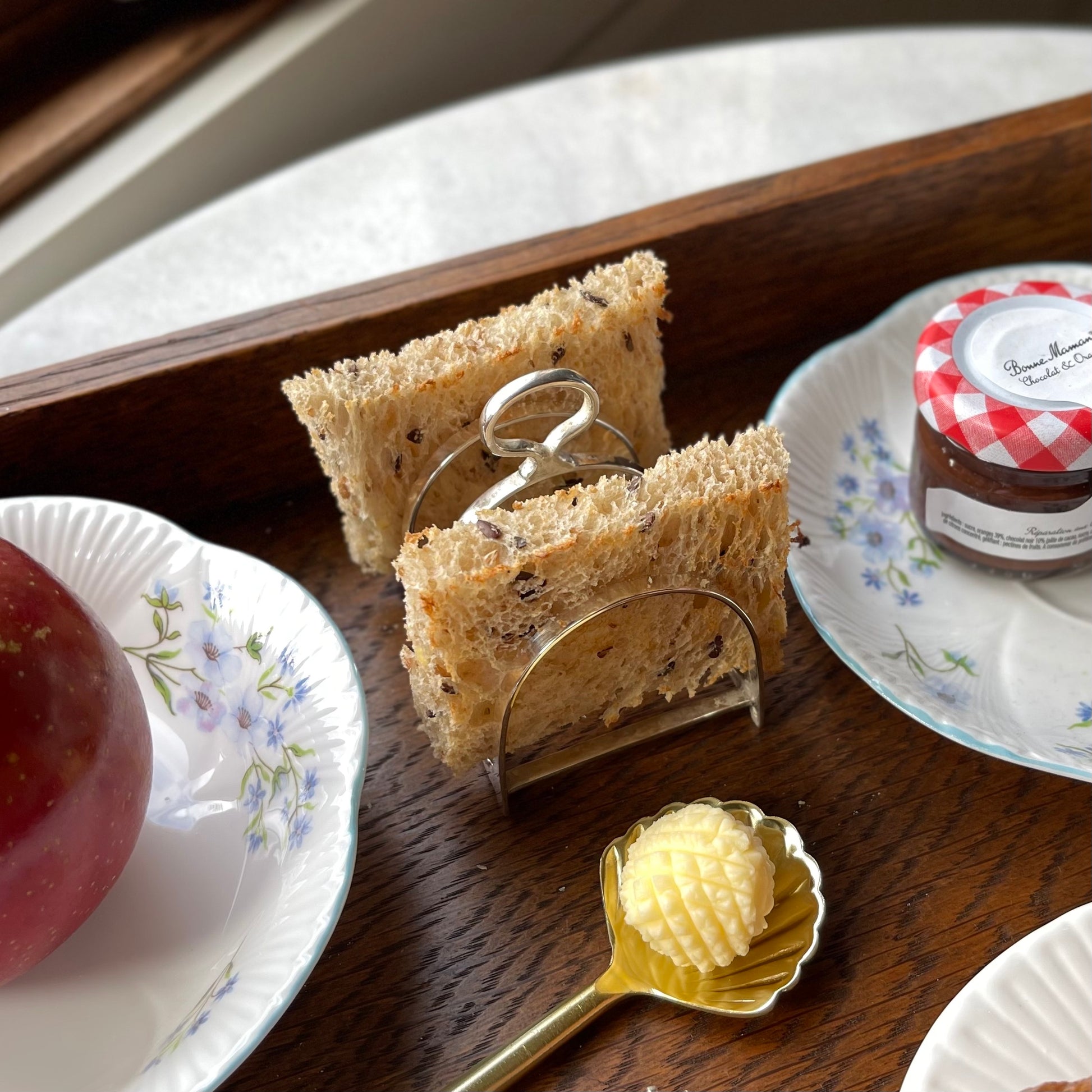 イギリス式にブレックファーストトレイを設えるにあたり、欠かせないアイテムがあります。朝食セットとともにトレイに収まるサイズのトーストラックです。