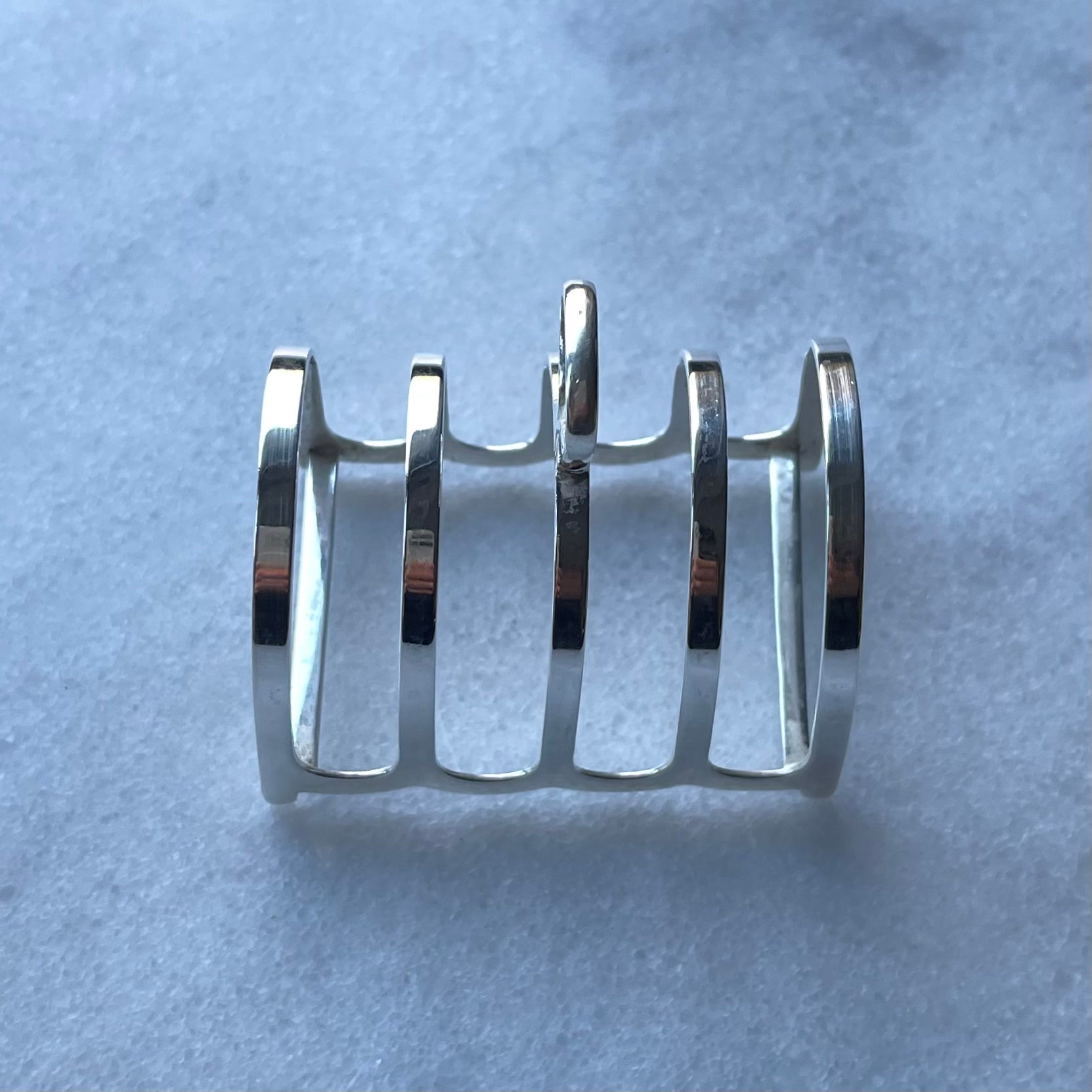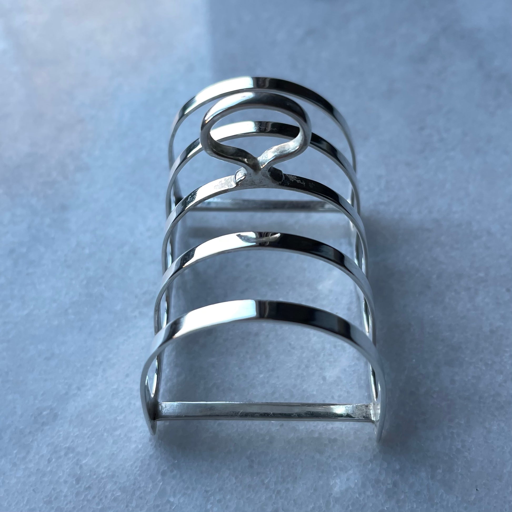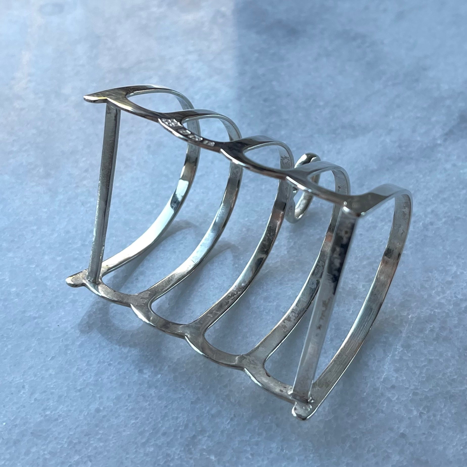 こちらのトーストスタンド、同じものが2つ入荷いたしております。1801年創業🏴バーミンガムで前世紀までシルバー製品を作り続けていたメーカー『バーカー・ブラザーズ社』が手がけたスターリングシルバーで、それを証明するホールマークが刻まれています。もう直ぐアンティークなお年頃ですが、いずれもコンディションの良いお品です。内側は若干白っぽく輝きを失った感がございますが、本来の美しさを取り戻すまで、シルバークロスなどの柔らかい布で定期的に優しく磨いてあげてくださいませ。次のオーナー様の手にお届けするまでの間は、私、店主が代わって磨かせていただきます。