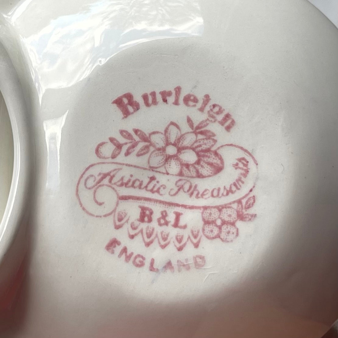 アジアティックフェザンツ柄でトーストラックが作られていたってご存知でしたか?お色味はバーレイ社さんのウェブサイトからの表現をお借りすると「ペタルピンク」トーン。詳しい製造年代はわからないのですが、こちらと同じ形のトーストラックが同社「アールデコ」ラインの様々な柄で発売されていたのが1930年代のこと。それに近い年代か、同じバックスタンプで70年代、80年代に作られた商品を拝見したことがございますので、もしかするとその辺りの比較的最近なのかも知れません。