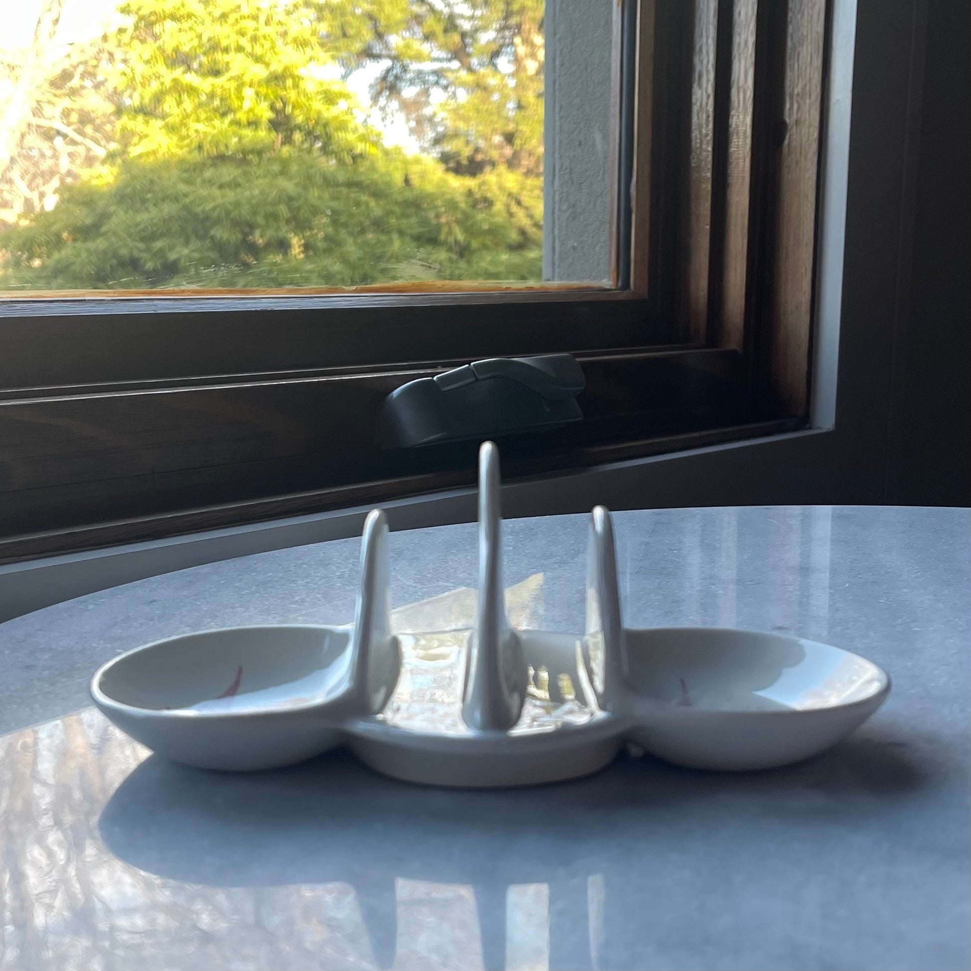 トーストが2枚立てられます。イングランド製には珍しく、日本の食パンでも挟めてしまいそうな比較的広めのスペース(約2cm幅)がございます。もしかして、イギリスやオーストラリアの薄切り食パンサイズだと一つの仕切りに2、3枚立てられてしまうかも。両端のボウルには、昔ながらのバター&マーマレード(ジャムというよりこの方がブリティッシュさが強調されますね☺️)でも、ソーセージやベーコン、卵料理などのしっかりとしたイングリッシュブレックファーストになさる場合は塩&胡椒を入れていただいても、使い道をあれこれ考えるのも楽しそうです💕