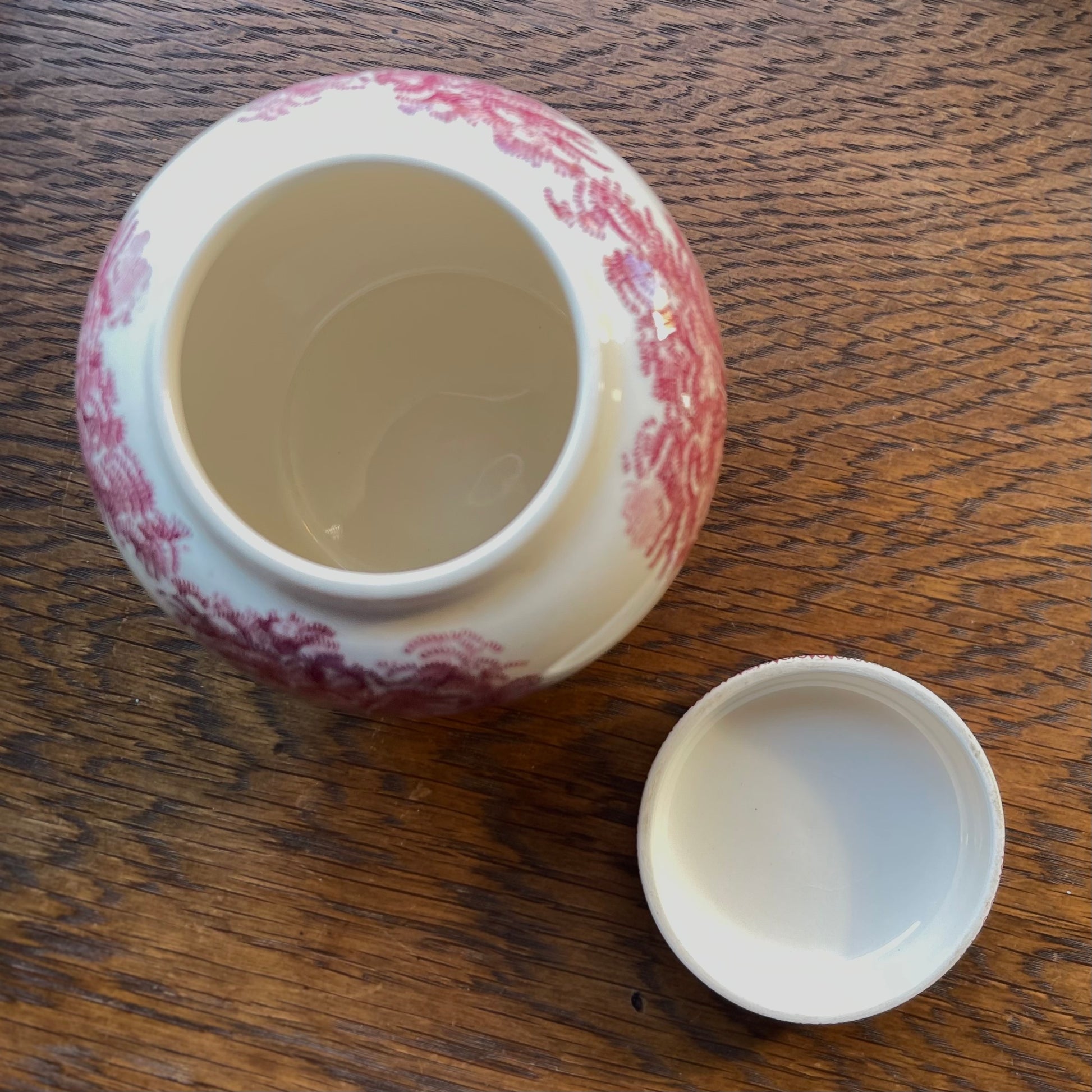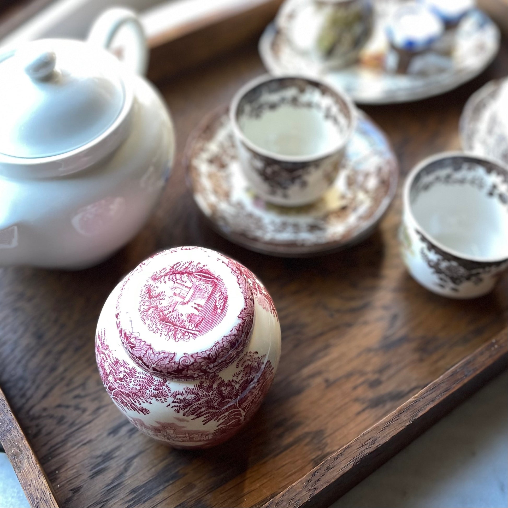 メルボルンでの買い付け中、メイソンズのティーキャディーにはよく出会います。パターンは、ウィロー柄が多めでしょうか。中には、紅茶の老舗トワイニングさんのロゴがメイソンズと並んで入っている、所謂ダブルネームのお品もあります。この度ショップへ持ち帰りましたティーキャディーには紅茶のメーカーさんのロゴは入っていませんが、買い付けた先の方が仰るに、「昔はこの容器に紅茶が入って売ってあったのよ」とのことですので、トワイニングさんでなければ、もしかすると他のメーカーさんの紅茶が入っていたのかも知れません。