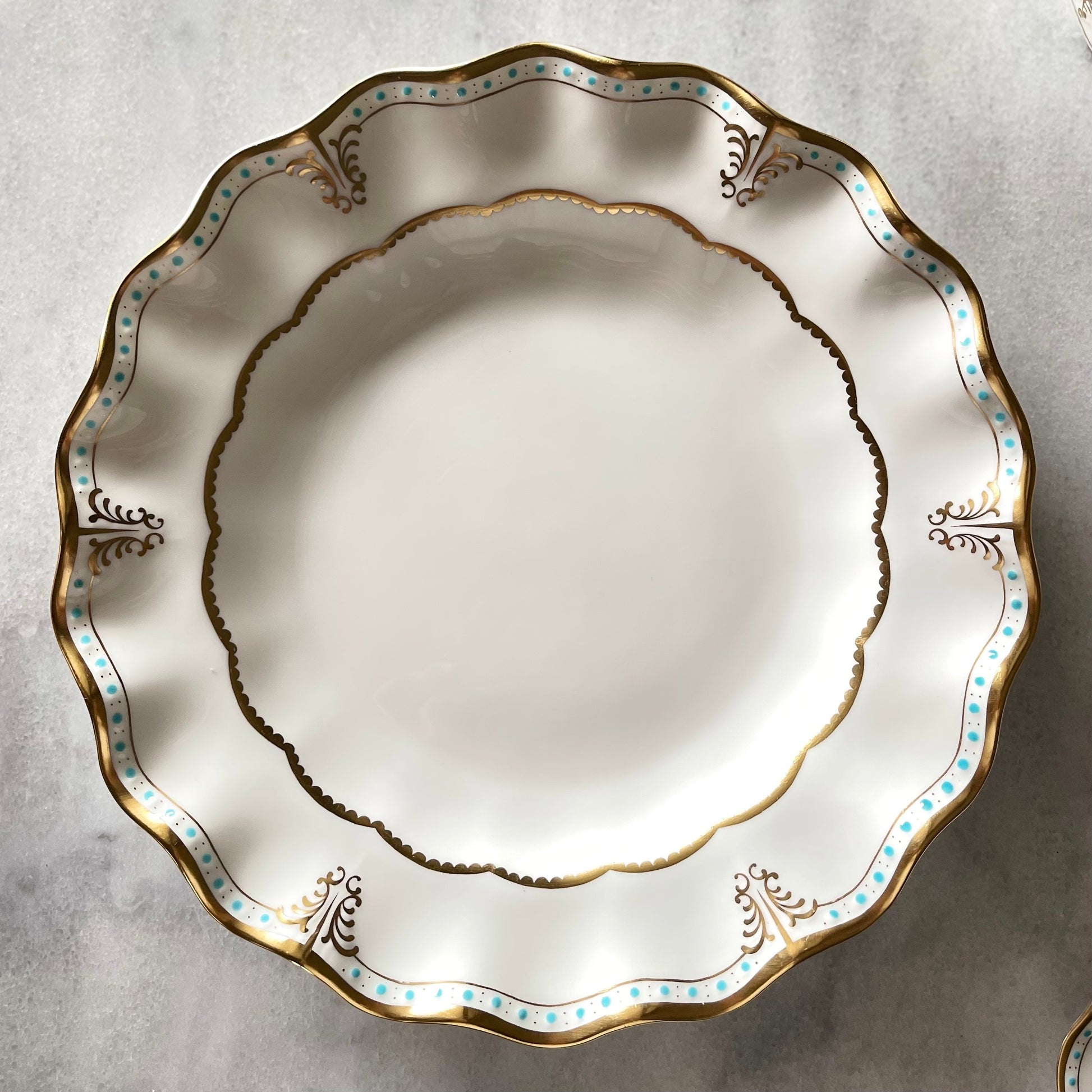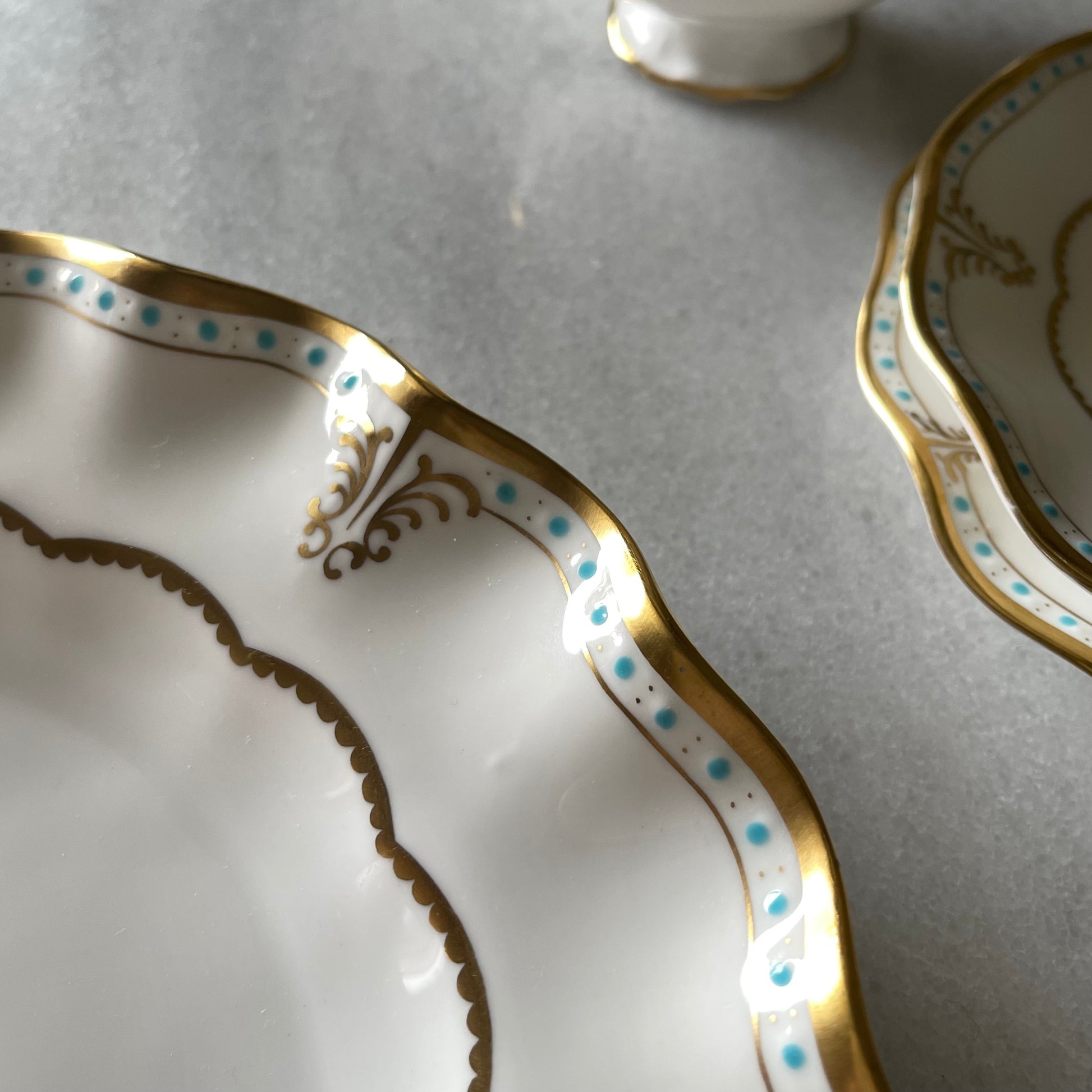 ロイヤルクラウンダービーの『ラグジュアリーファインボーンチャイナ』の美しい白地に、22カラットゴールドのハンドペイントがシンプルに輝く<エリザベスゴールド>というシリーズがございますが、今回入荷いたしましたこちらの<ロンバルディ>は、白地と基本のデザインは前述のシリーズと同じくして、宝石が散りばめられたように見えるドット部分のみターコイズブルーを組み入れた配色で、今はもう廃盤となったシリーズです。