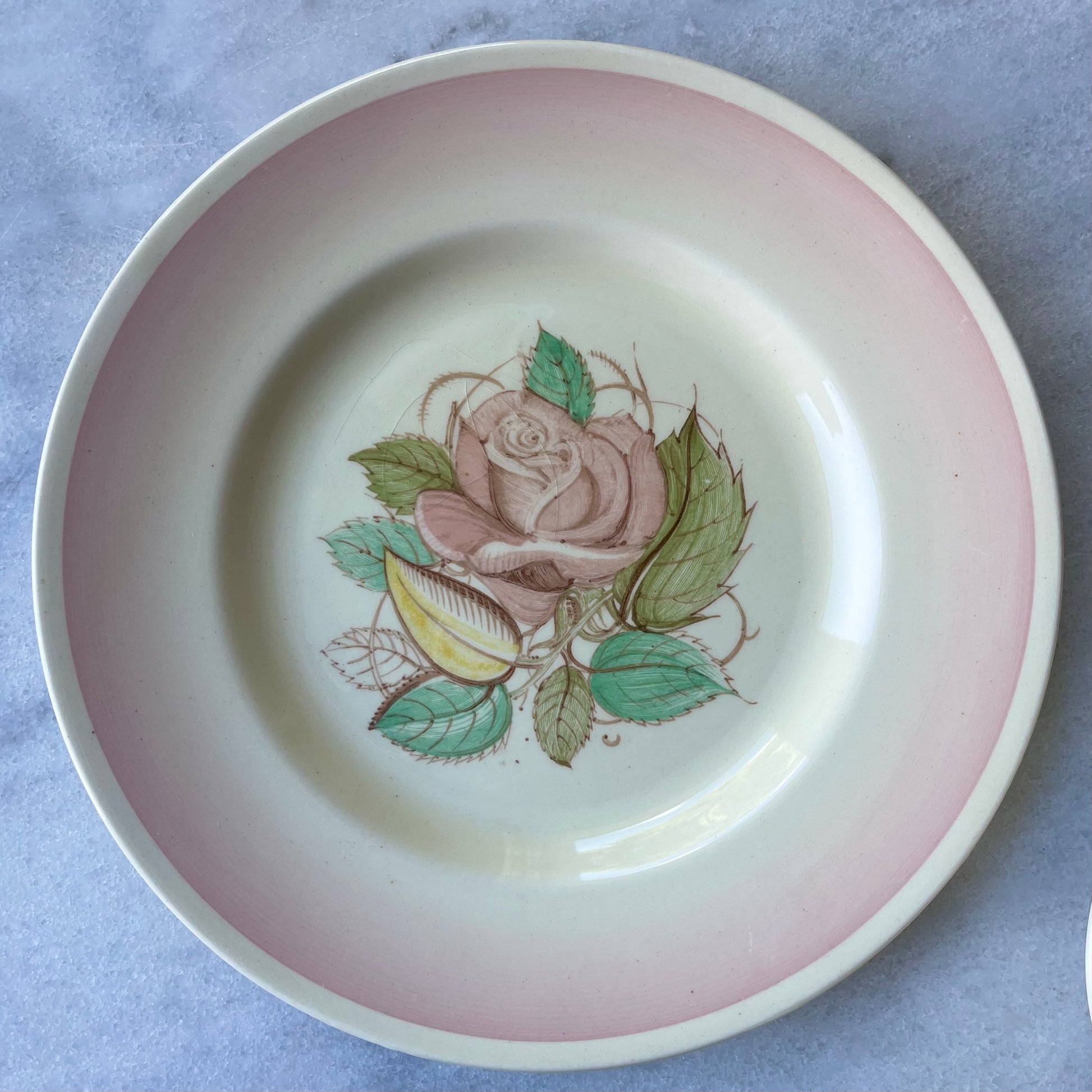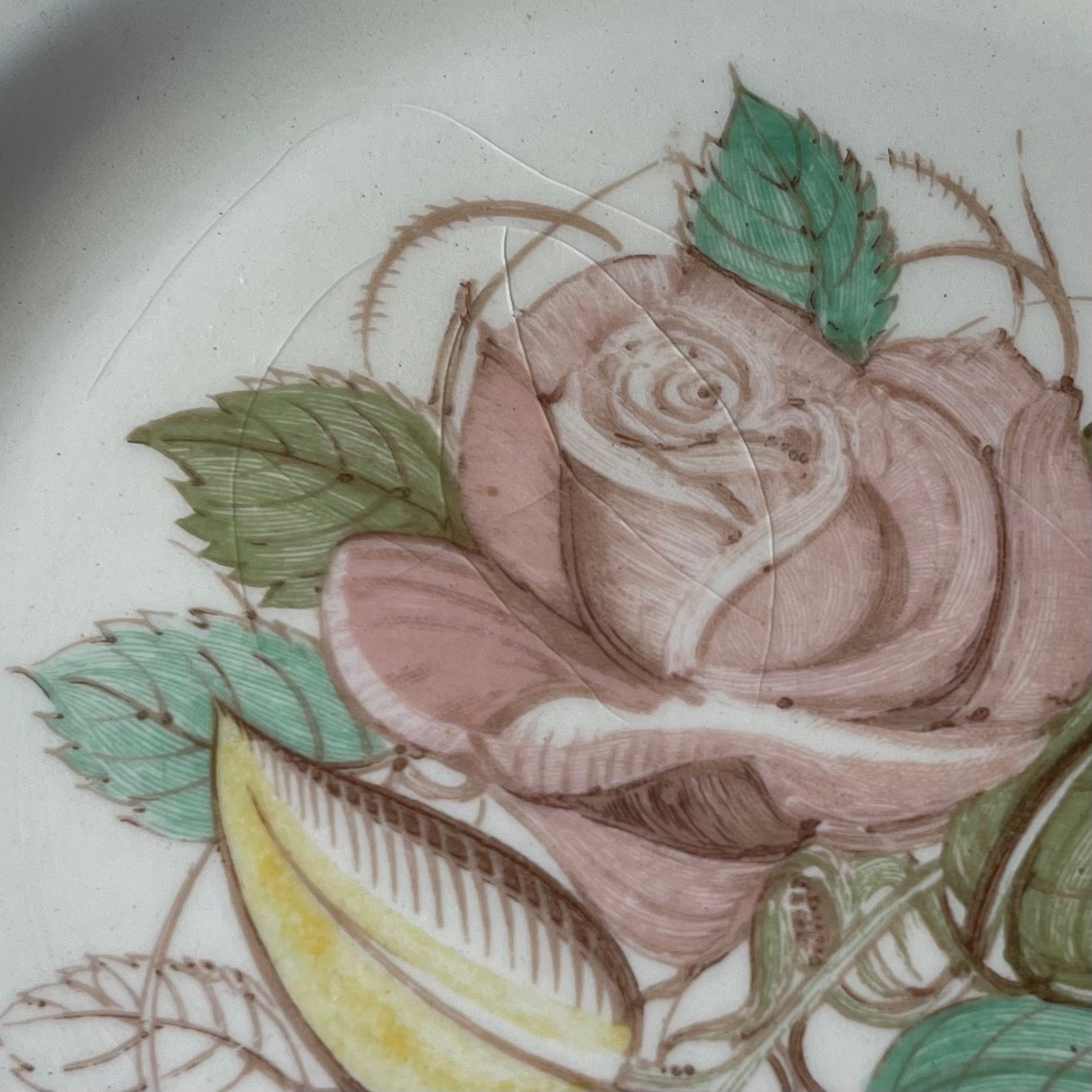 初代<パトリシア>、後に<パトリシアローズ>と呼ばれるようになったパターンが登場したのは1938年のこと。ピンクのバラのモチーフに、徐々にカラーや縁模様などのデザインバリエーションが増えて行ったようです。中心のバラの絵柄は、発表当初からリトグラフ転写が施されています。本品は、店主の感ですと、39年に登場したピンク・ワッシュ・ボーダーだと思うのですが、どうでしょう。