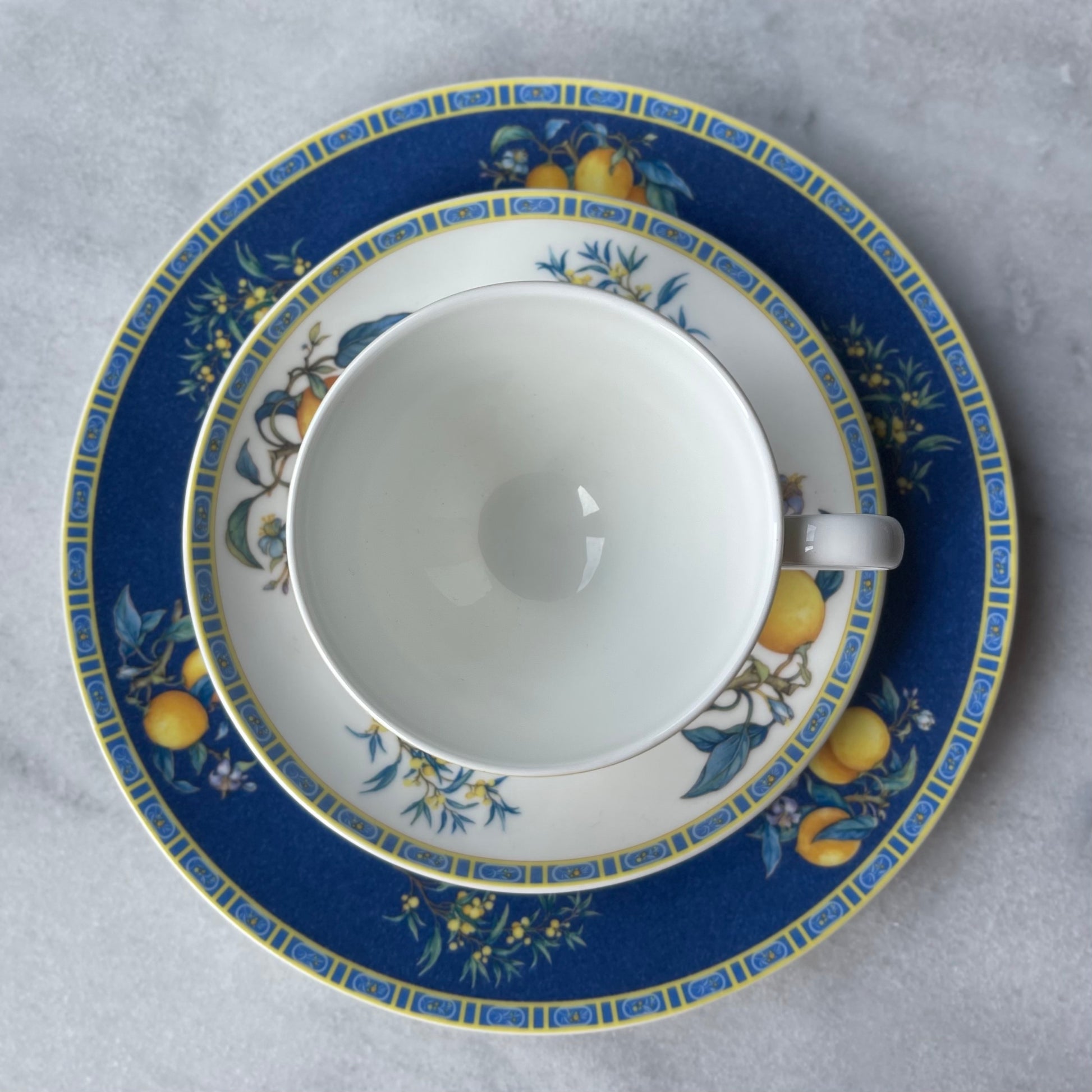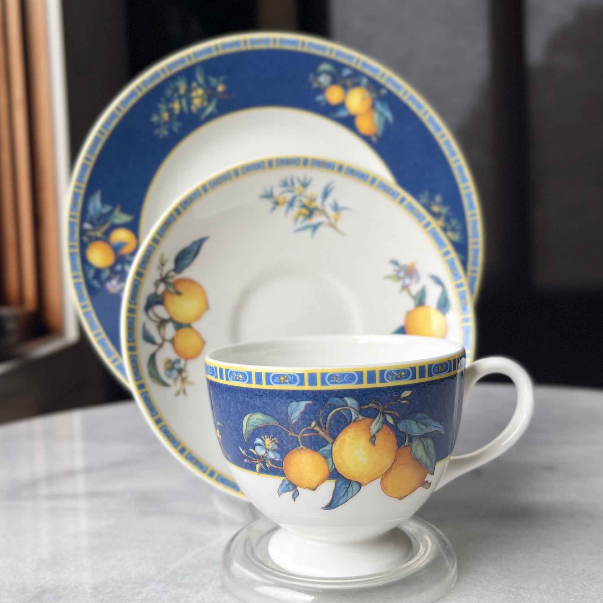 ボーンチャイナの美しい白地にパウダーブルー風の塗り、そこにレモンの葉と実が色鮮やかに描かれており、フランス語でレモンを意味する『シトロン』と名付けられたシリーズです。レモンを使ったお菓子は数多くありますよね。季節を問わず、大活躍してくれそうなトリオです。ブルーに鮮やかなイエローとレモンのモチーフは、冬でも暖かな陽が降り注ぐであろう地中海性気候の南欧で過ごす冬のバカンスを彷彿とさせます。ガーデンティーパーティーのようなシーンでもお使いいただけるのではないかと存じます。