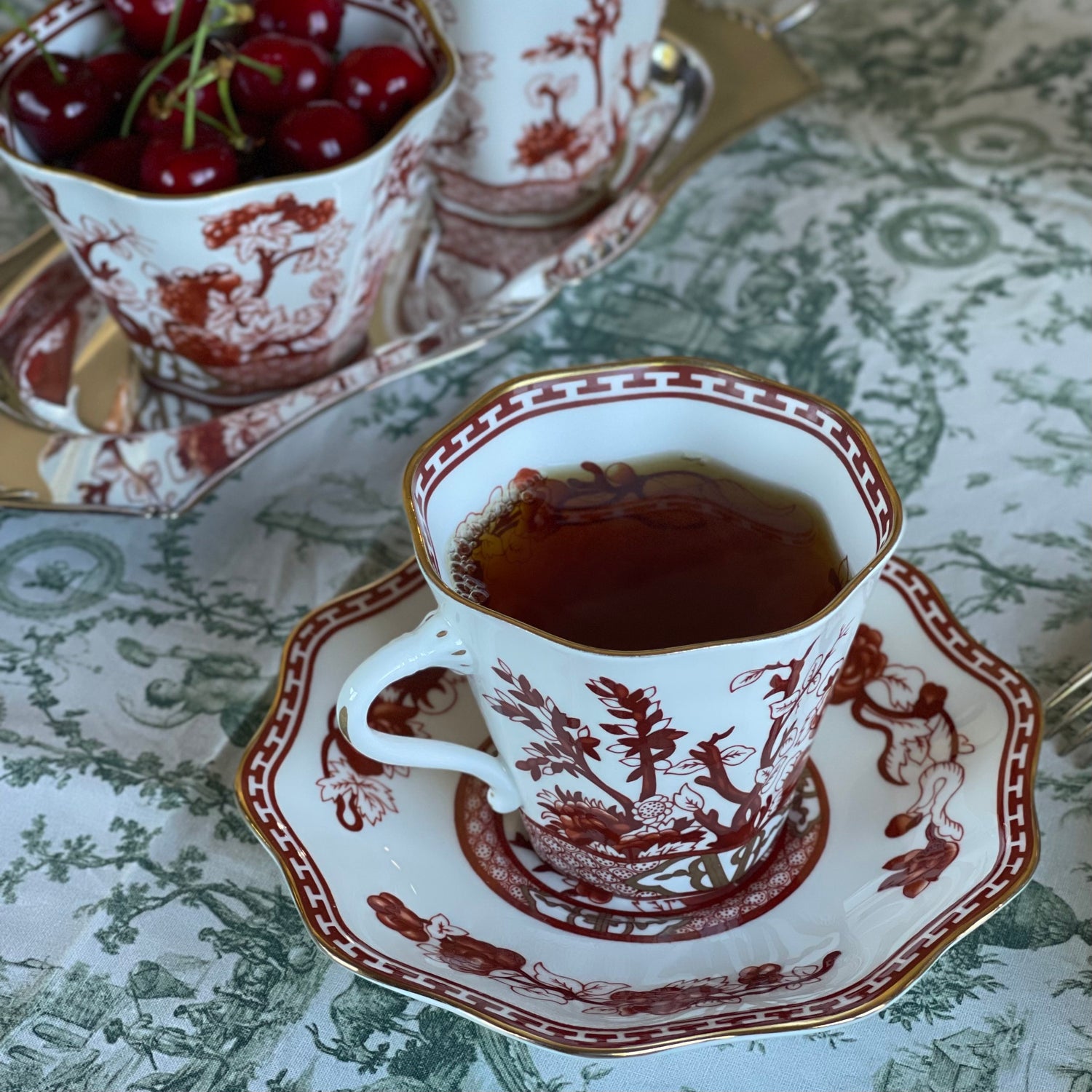 英語では通称インディアンコーラルツリーやコーラルツリー(珊瑚の木)と呼ばれる梯梧(デイゴ)をモチーフとした人気の図柄です。実際のお品も、梯梧の花色を彷彿とさせ燕脂色で、ボーンチャイナ特有の透光性と光沢のある白地とのコントラストが際立った品のあるティーセットです。