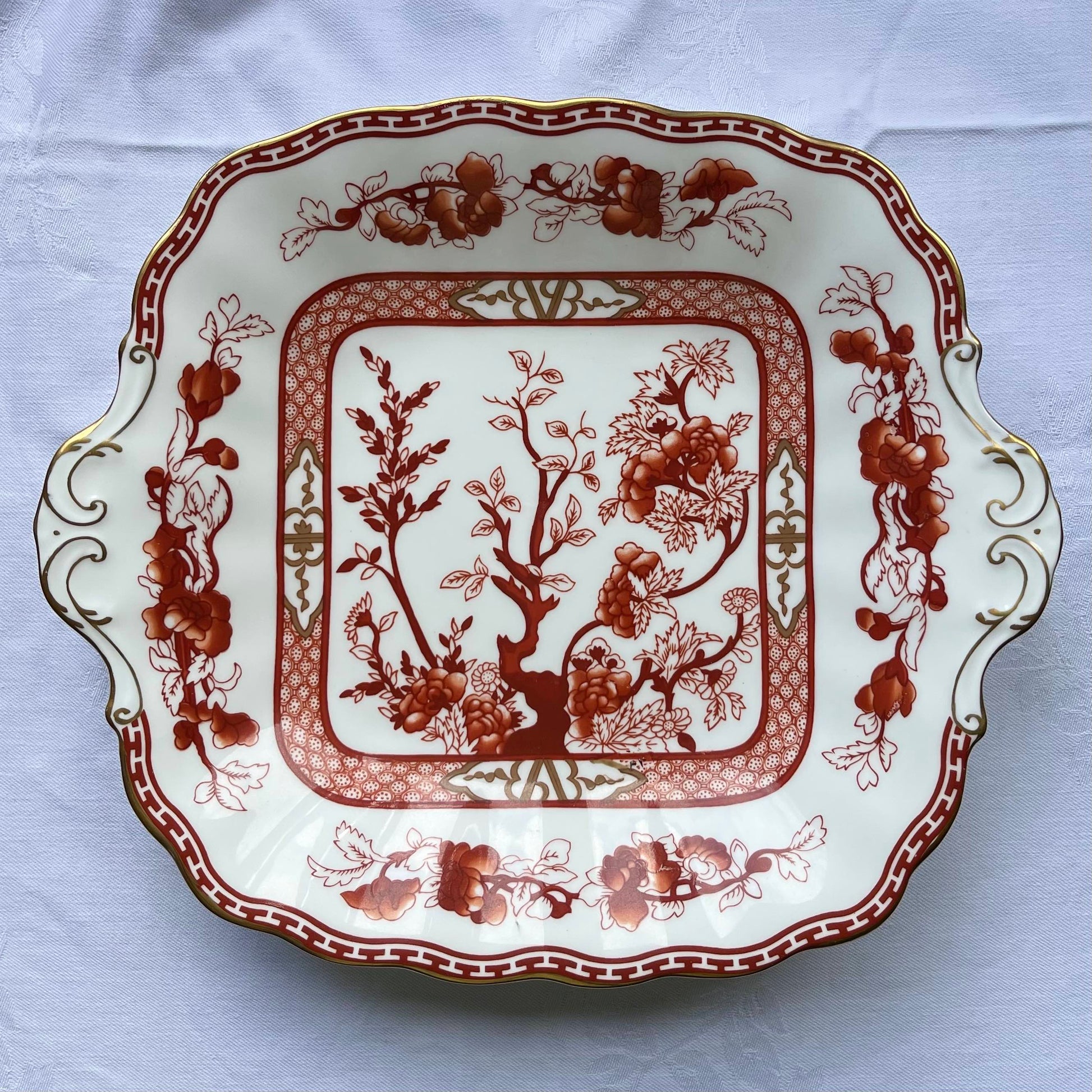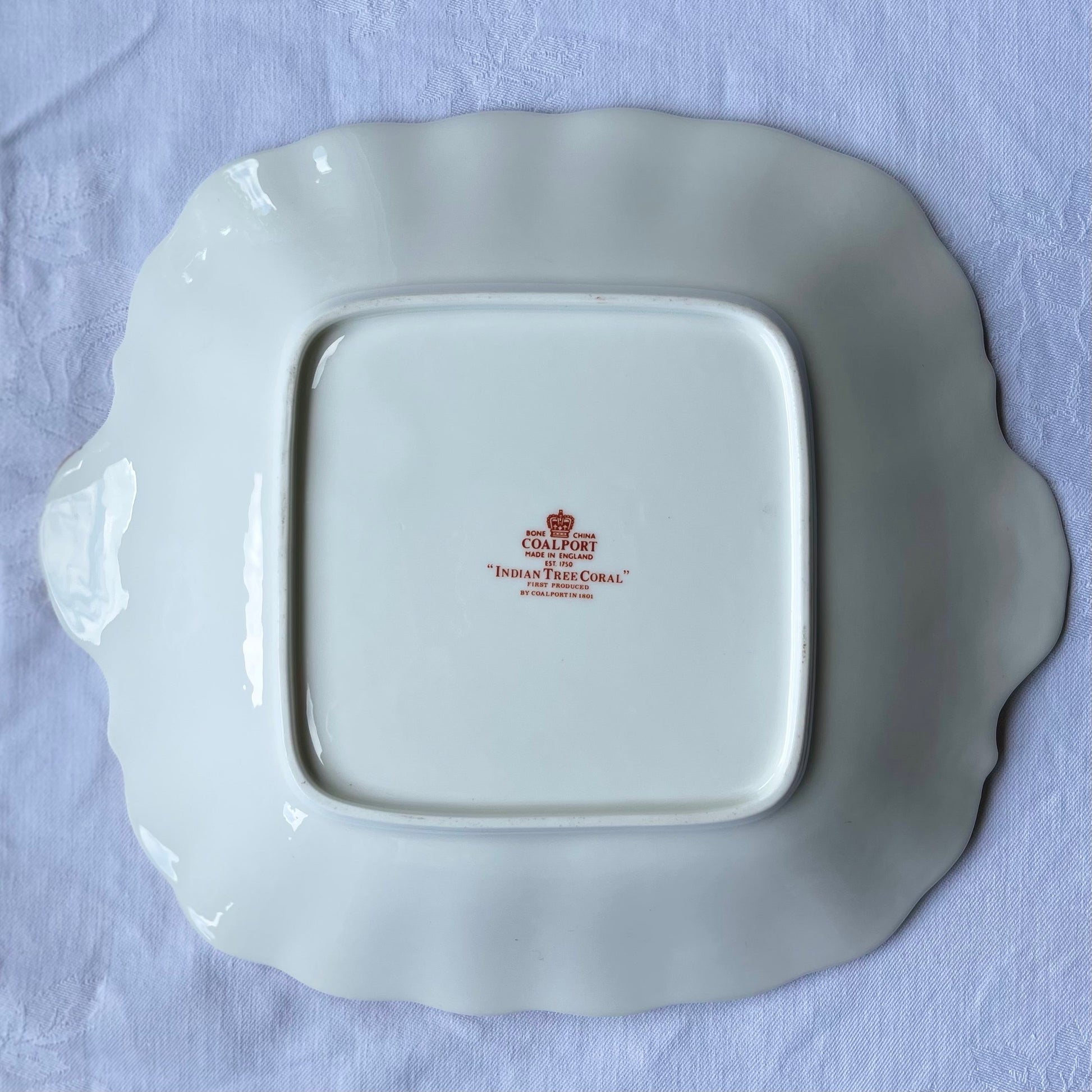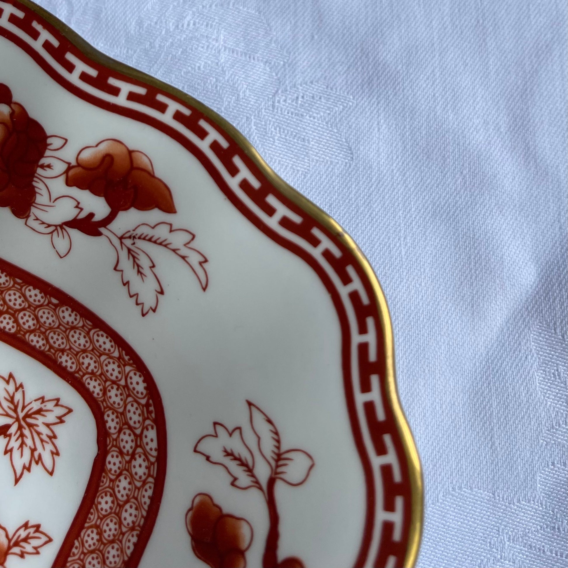 コールポートの代表的なパターン『インディアンツリー』の『コーラル』ブレッド&バタープレート(BBプレート)です。4号の3、4人用ホールケーキが中心の平らな部分に丸ごと収まるサイズ感で、焼き菓子の詰め合わせやサンドイッチを盛り合わせても様になりそうです。